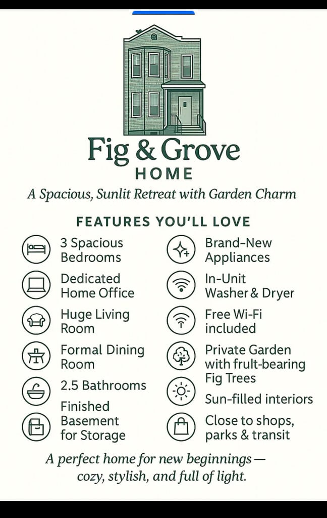 FIG & GROVE HOME A Spacious, Sunlit Retreat with Garden Charm Amenities & Features: 3 Spacious Bedrooms Dedicated Home Office Huge Living Room Formal Dining Room 2.5 Bathrooms Finished Basement for Storage Brand-New Appliances In-Unit Washer & Dryer Free WiFi Included Private Garden with Fruit-Bearing Fig Trees Sun-Filled Interiors Close to Shops, Parks & Transit Welcome to Fig & Grove Home, a warm and inviting house on Grove Street designed for comfort, sunlight, and family living. With 3 bedrooms, a huge living room, a formal dining room, a dedicated home office, and 2.5 bathrooms, this home offers all the space you need to grow with 3 full levels. Step outside to your private garden with mature fig trees, where you can enjoy morning coffee, fresh fruit, or peaceful morning. Inside, sunlight fills every room, and everything is move-in ready with brand-new appliances, in-unit washer/dryer, free WiFi, and a finished basement for storage. Full private backyard garden/ oasis for entertaining with grill and full patio set overlooking gorgeous trees. Serene and peaceful street near blue ribbon schools and great transportation to NYC and NJ hubs. As a completely private residence, and with dedicated property manager available 24/7. Won't last, come tour it!