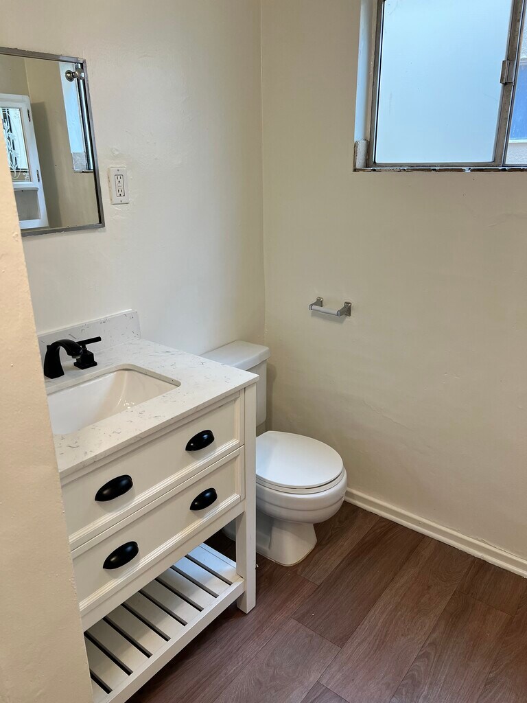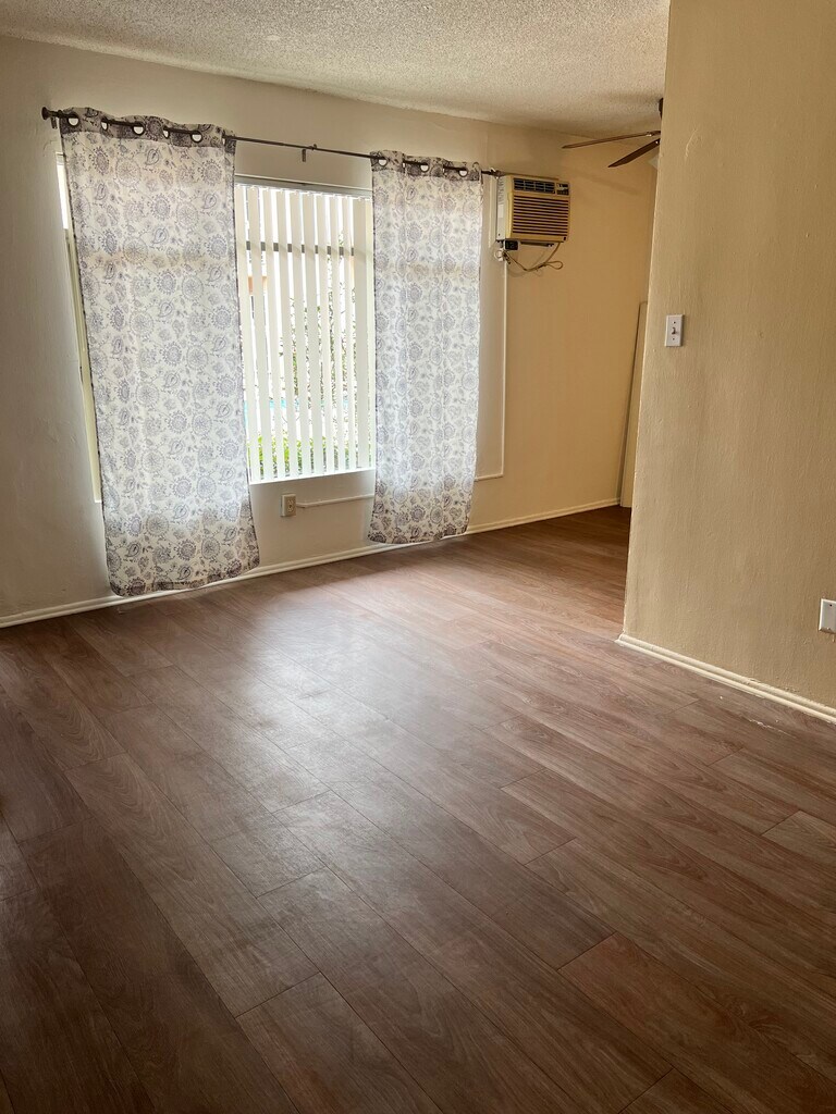 lower 1 bedroom 1 bath unit with shared garage. laminate floors throughout the unit Air conditioner and sparkling pool for those sunny days. Bedroom has a walk in closet and 2 additional closets in hallway as well Walk to shopping and bus stop. New paint and window coverings.