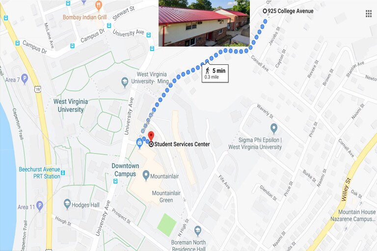 Great location, 5 min walking from WVU downtown campus. Free parking, trash removal & WIFI. Newly constructed