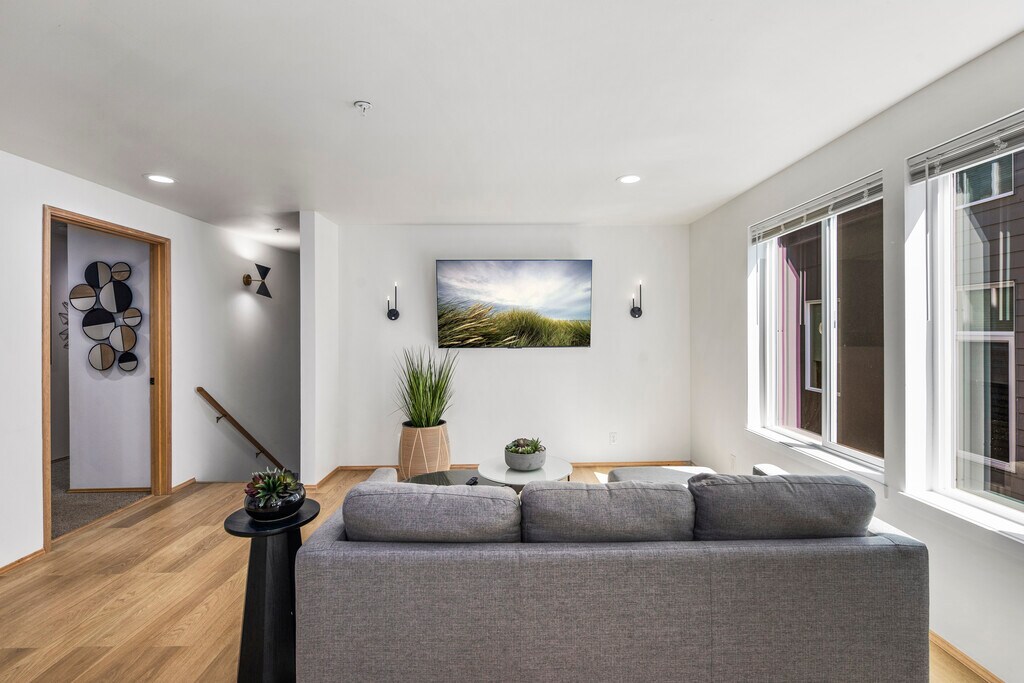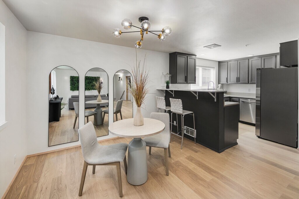 Full of natural light! Tucked away near the end of private road. Fluffy towels, fresh linens, new 65in TV, fast WIFI. Full kitchen w/ quartz, updated appliances & gas range. Large, open concept living & dining. Covered parking right out front door. Washer/dryer in unit. Pet friendly. New windows throughout, upgraded appliances, quartz, fresh paint, new LVP floor, new lights, new fixtures. Large, quiet, freshly remodeled unit. Full of natural light and tucked away near the end of a private road. 7 minutes to Green Lake beach, park, dock (kayak rentals), trails, and tennis courts. Full kitchen with quartz countertops, gas range, updated appliances. Fresh linens, fluffy towels, new 65 inch TV, stocked kitchen, fast WIFI. Netflix or other streaming service may be included upon request. Many new updates throughout the unit. Pet friendly.