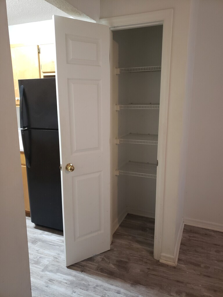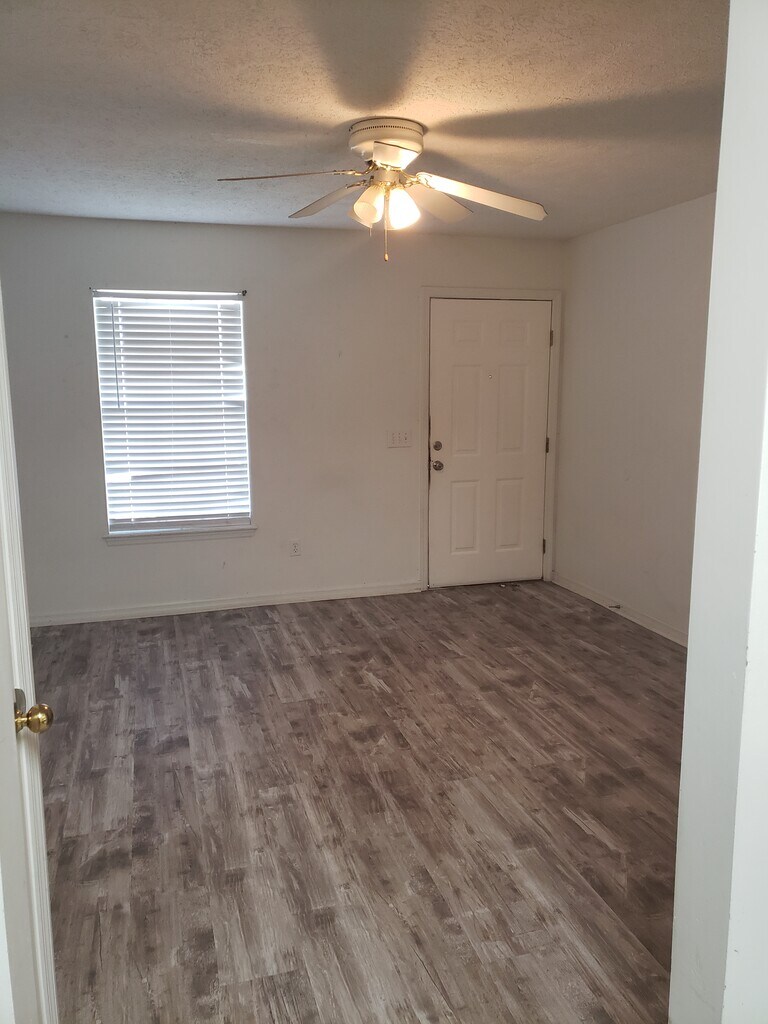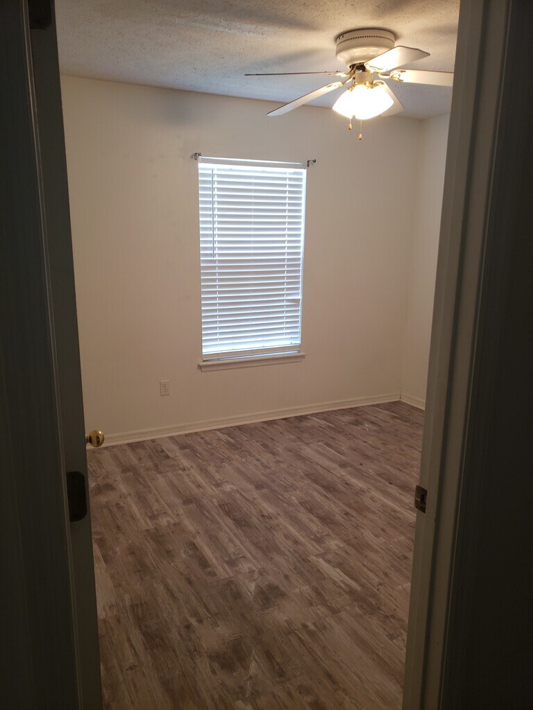 Apartment nestled in a quiet part of town, but within minutes of shopping, eating and more! Convenient layout features two spacious bedrooms with walk-in closets, one full bathroom and a stocked kitchen with an electric range, refrigerator and dishwasher. LVP flooring throughout the unit and a shared covered porch on the back. Personal laundry room also doubles as extra storage space for unit.