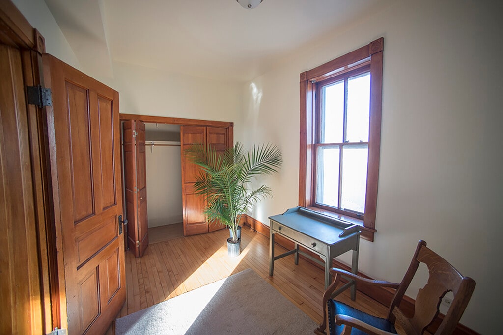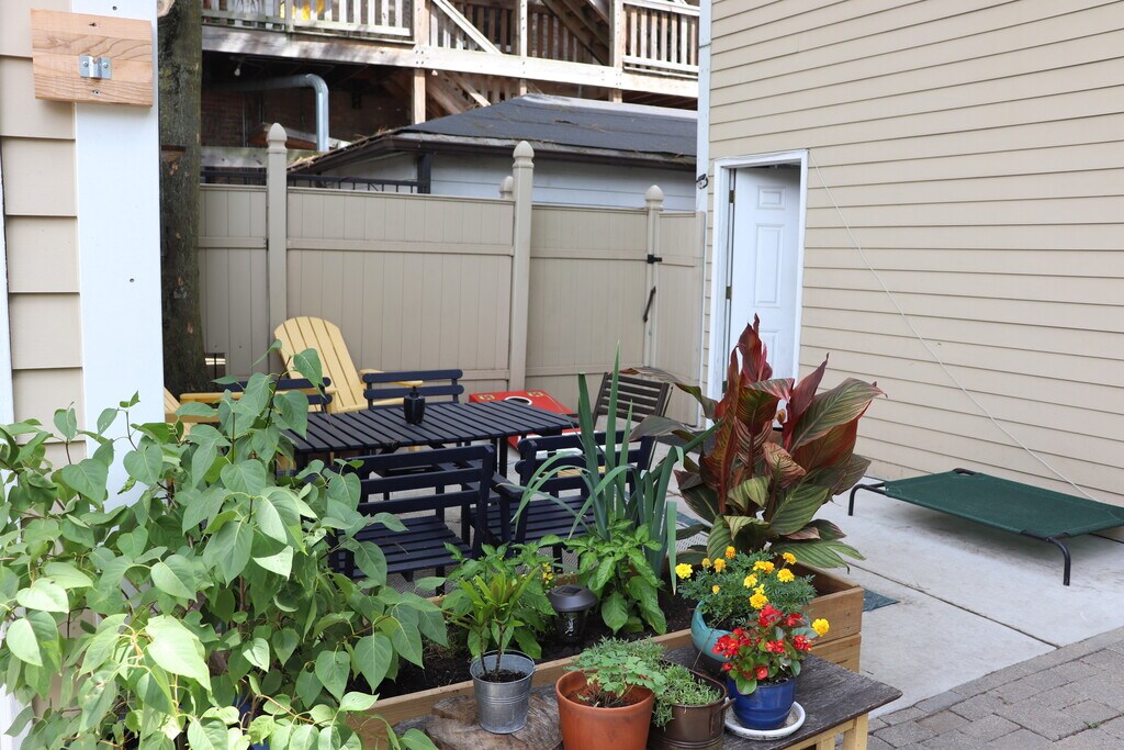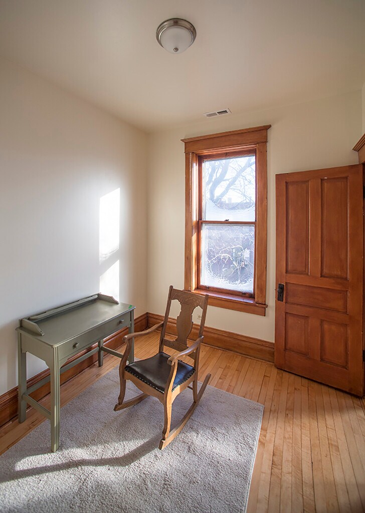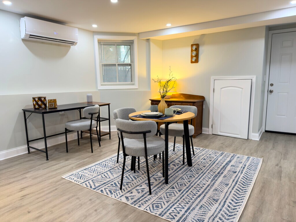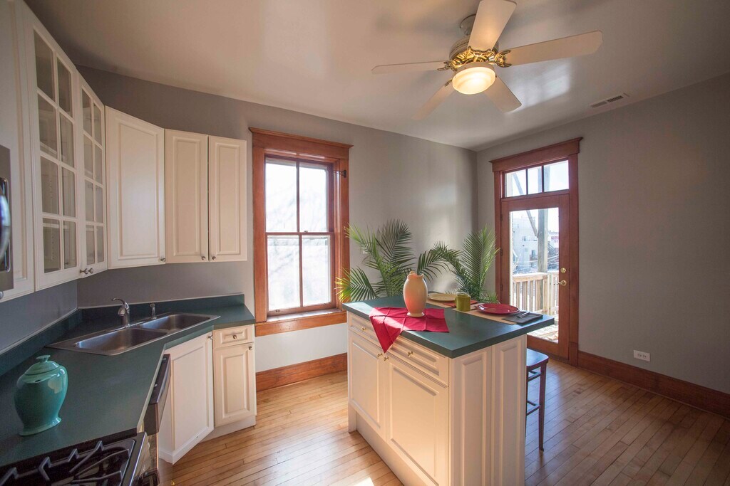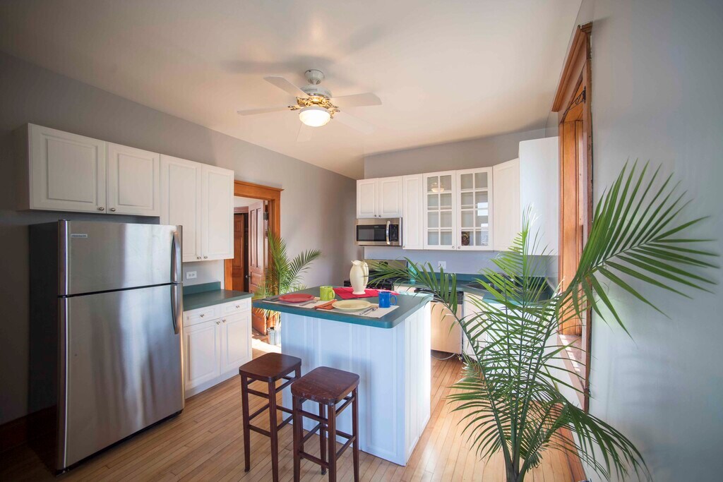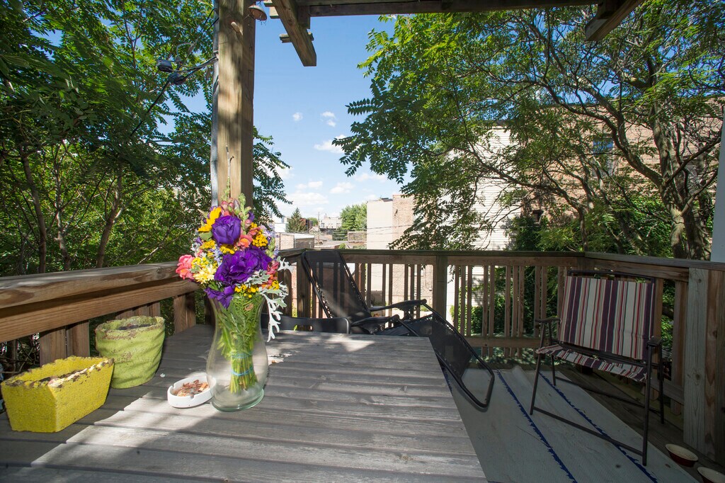 This fully-furnished 2 bed+office has all original woodwork with a bay window, leaded glass, oak and tile fireplace, pocket doors, 10 ft. ceilings, hardwood floors throughout, and a shared yard. Sun through every window! The second bedroom is set up as a nursery, but I can change it to a full bedroom easily. The bright, cheerful kitchen has plenty of storage, with a dishwasher, microwave, and an island with counter seating. Step out onto your private back balcony for a morning coffee or al fresco dinners!The street is tree-lined and quiet in a safe neighborhood. The neighborhood is just south of Wicker Park and is inhabited mostly by 30-somethings, with cute shops bars and restaurants within walking distance. It is a couple blocks to the Chicago and Damen buses A 20 minute walk brings you to the Blue Line L for a 10 minute ride to downtown.