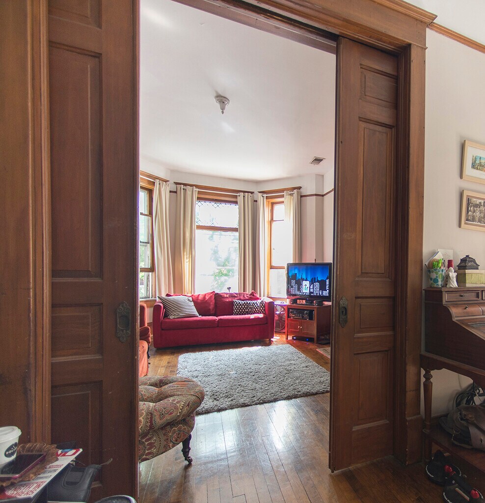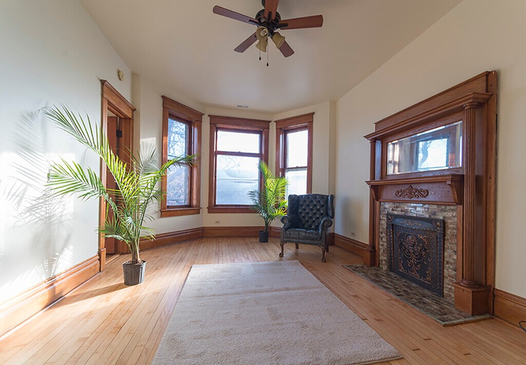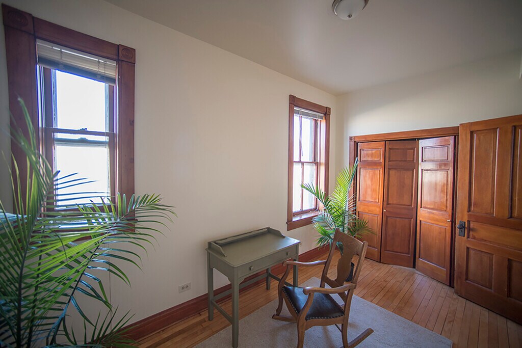 This fully-furnished 2 bed+office has all original woodwork with a bay window, leaded glass, oak and tile fireplace, pocket doors, 10 ft. ceilings, hardwood floors throughout, and a shared yard. Sun through every window! The second bedroom is set up as a nursery, but I can change it to a full bedroom easily. The bright, cheerful kitchen has plenty of storage, with a dishwasher, microwave, and an island with counter seating. Step out onto your private back balcony for a morning coffee or al fresco dinners! The street is tree-lined and quiet in a safe neighborhood. The neighborhood is just south of Wicker Park and is inhabited mostly by 30-somethings, with cute shops bars and restaurants within walking distance. It is a couple blocks to the Chicago and Damen buses A 20 minute walk brings you to the Blue Line L for a 10 minute ride to downtown. Hardwood floors throughout Newly renovated kitchen Gas range Dishwasher Newly renovated bath and power room Bedrooms fit queen bed and dresser easily with walk-in closets. Dogs welcome Central air conditioning and forced air heat. 8 by 8 lockable storage area laundry in building Plentiful street parking I'd be happy to show it to you!