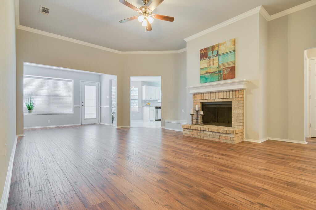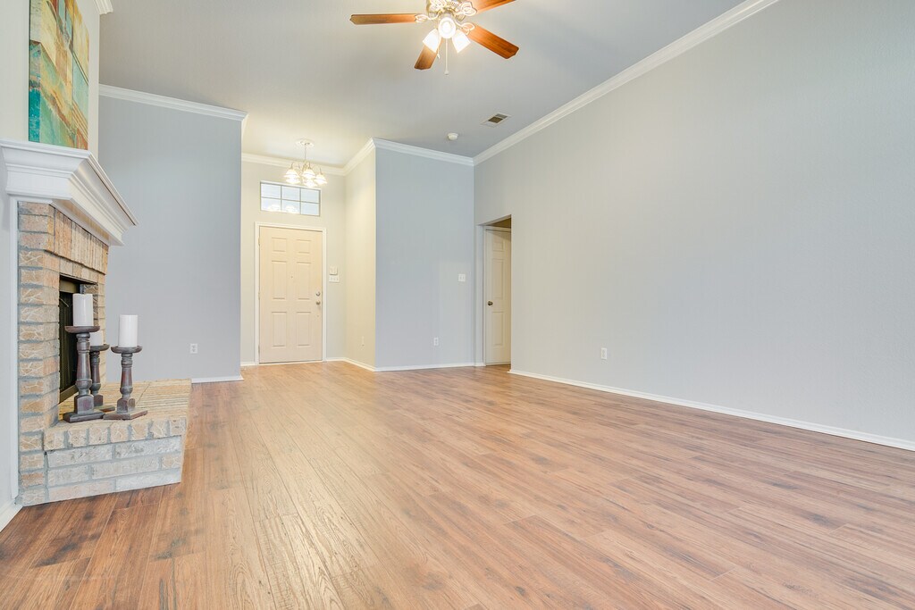 Charming updated 3-bedroom, 2-bath home with wood laminate flooring, fire place, stainless steel kitchen appliances, granite kitchen, spacious kitchen with stainless appliances (microwave, stove, and dishwasher), large family room with extra space for office, master bedroom Suite with walk-in closet, in house laundry hookup, central air and heat, 2 car attached garage, privacy fenced back yard, patio, one level traditional style home with fireplace. Safe neighborhood near all the conveniences. Great location! You will enjoy making this house your own! Seeking well qualified tenant with household income at least 3 times the rent, full-time employment, no criminal history, good credit history, and good previous rental references and history. This is a smoke and vape free property. Tenant provides Washer, Dryer and Refrigerator. Tenant pays for utilities and lawn maintenance. A single small non-aggressive breed dog, weighing less than 35 pounds is the only acceptable pet allowed at this property. Great location near conveniences.