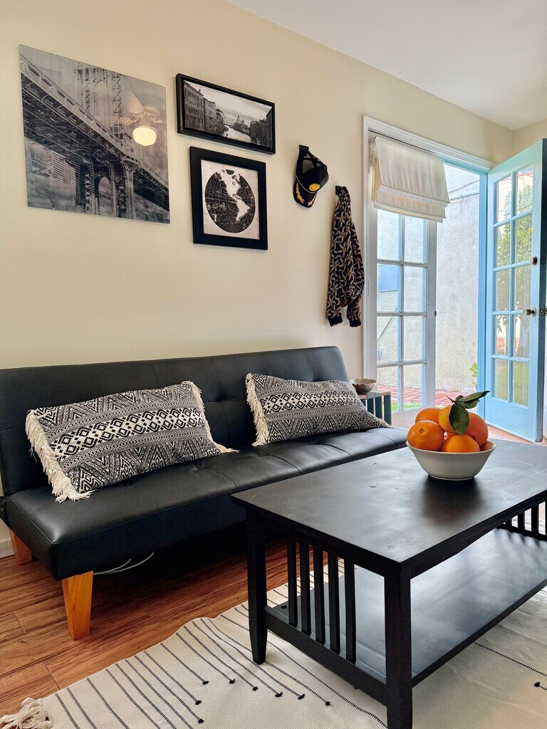 Available beginning 3/1/2036 $1700/MONTH ALL UTILITIES INCLUDED - gas, water, electricity, trash, and WIFI! Month-to-month lease, 30 days notice to vacate, preference given to longer stays Private entrance. Furnished. Shared yard. Laundry on site. Street Parking. Completely furnished private studio guesthouse a stone's throw from downtown Culver City. The happy, cozy studio has hardwood floors and comes completely furnished with a queen bed, bedside dresser with lamp, fold-down sofa, coffee table, desk and chair, and wardrobe. The kitchenette comes complete with mini fridge, microwave, electric two-burner cooktop, electric tea kettle, and some dishes/silverware. No proper stove or sink, sorry :( Full private bathroom has been updated with modern, walk-in tile shower. Linens, towels, and dishes may also be provided - it's ready to go. Laundry on site in the main house - just coordinate with me via text! Private entrance through pretty French doors that open to a back courtyard. Have a bite in the comfortable, sunny outdoor dining space and relax around the fire pit under our fruitful orange tree. The back yard is shared with the tenant in the other studio, my family and pup, Roo. Please only contact if you're comfortable with dogs! She's small (9 lbs.), quiet, and super friendly. Awesome neighborhood - walk 2 blocks to downtown Culver City. Tons of delicious restaurants, the Culver Steps, and the Culver movie theatre . The Palms Expo Line stop is also within walking distance - get to Downtown, Koreatown, USC, and Santa Monica super easily.