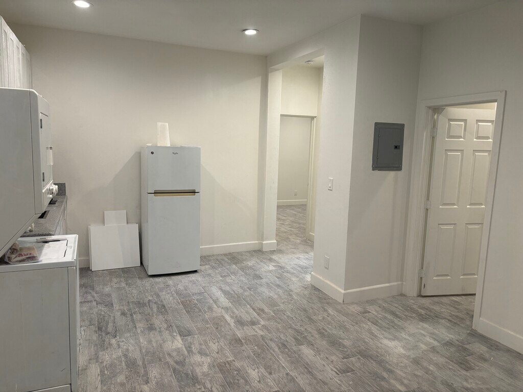 Entirely new 1yr old 2 Bedroom 1 Bath connected by a single wall. The unit has efficiency kitchen. In unit laundry. Tile throughout for easy cleaning. Full bath with step in tub shower combo including custom tile surround. Beautiful unit for small family. Close to 5, 91, 22 freeways (~ 2miles). Off street parking for 1 car.
