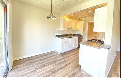 Gorgeous 3 bedroom and 2 bath upper unit located in Woodlake Villas in La Habra. Dining room, living room, and breakfast nook. Custom upgraded kitchen, light bright cabinets, newer stainless-steel appliances, track lighting with exposed beam ceiling, and subway tiles. Wood like waterproof vinyl laminate flooring throughout, recessed lighting, a new HVAC unit, wiring for surround sound, vaulted wood beam ceiling in the bedroom off the living room. Large windows to let the light in and a slider to your balcony overlooking the pool area. Clean on site laundry rooms. Comes with enclosed 2 car garage. Additional parking spot can be requested through Association for an additional approx. $30/month. Close to all grade level schools, 15 minutes to CSU Fullerton, all shopping, amenities, and restaurants. Beautifully maintained complex, peaceful and in a nature setting. Use of pool and spa, BBQ, and community dog park. Small dogs and cats ok with an additional deposit and rent. Rent includes gas, water, trash.