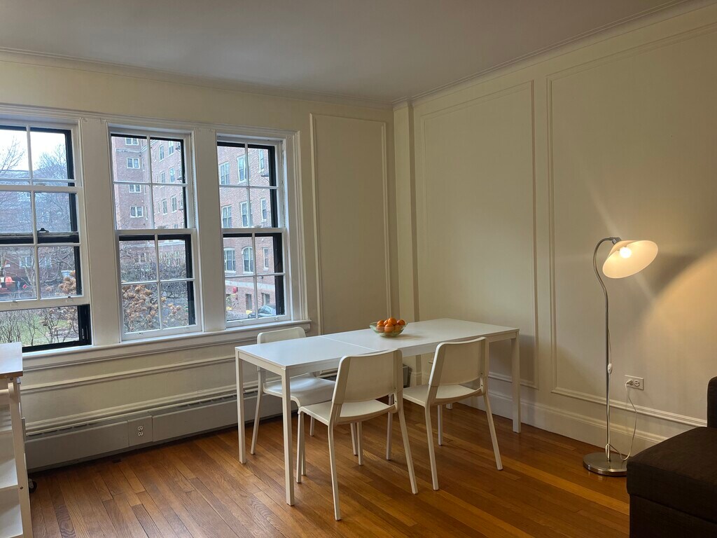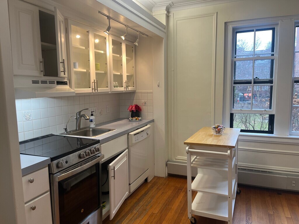 Beautiful 1 bedroom apartment in a historic brownstone overlooking memorial drive. Kitchen appliance and bathroom fixtures updated in the last 2 years. 5 minute walk to Harvard square from back entrance on Brewer st. Steps from the Kennedy school, Harvard school of education and HBS. Apartment was painted in the last week. Can come partially furnished with couch (that opens out to a full bed with storage underneath), dining table and chairs. The apartment building has move in fees $300. Also has 2 elevators for easy move in. apartment overlooks the garden and conveniently located on the second floor. Super stays in the building. Move in cost- first and last month's rent