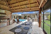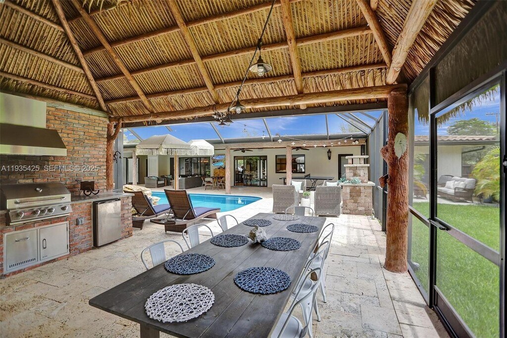 Welcome to Pine Knoll at The Falls — a rare estate home on an oversized corner lot offering exceptional space, privacy, and fully upgraded living. Introducing a resort-style home situated on a private builder's acre and a total of 3,356 sqft. this property offers a luxurious and comfortable living experience. The main house features three bedrooms and two bathrooms, while outside there is a separate cabana with one bedroom and one bathroom. The outdoor area has a screened-in eight-foot-deep pool with a beautiful waterfall and heater, for your convenience. Additionally, there is an outdoor kitchen with a charming Chicago brick under a tiki-style roof. Inside, the home offers an open-concept layout, with the kitchen featuring high-end Viking appliances. The home comes fully furnished and decorated, making it move-in ready for you. This property is the epitome of turnkey living, offering a harmonious blend of comfort and style.