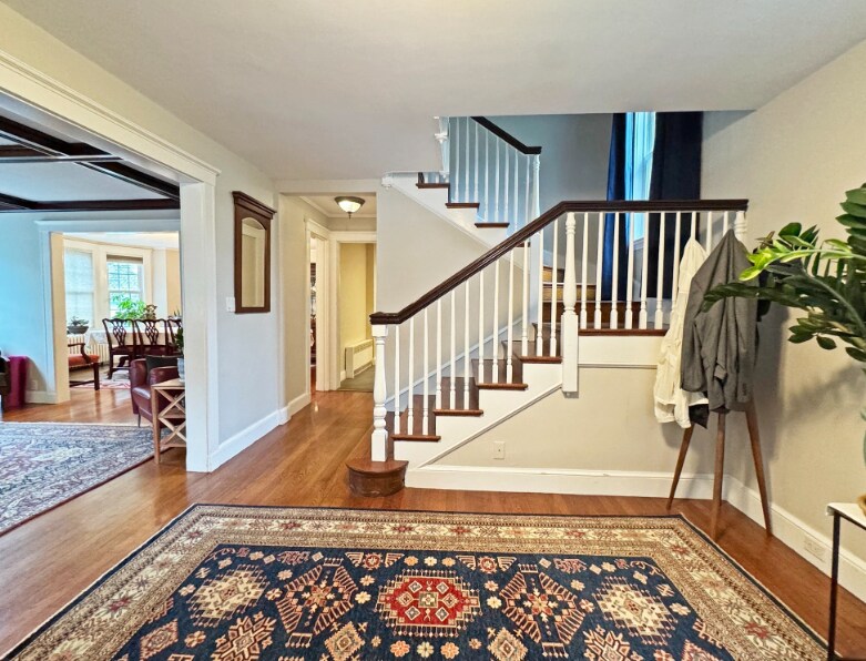 Stucco Colonial in Auburndale across from Williams Elem. Location is perfect for commuting. Easy access to the MA Pike & 95 exits as well as walkable to the Commuter Rail, 558 bus, Star Market and the many shops & yummy restaurants in Aub Sq. Large, elegant foyer leads to charming LR featuring beamed ceiling & fireplace. Formal DR with hardwood floors throughout the home. Inviting granite kit has top notch appliances (French door fridge, Viking oven), breakfast island & plenty of cabinets and laundry area. Family room off kitchen w/ sliders to deck for outdoor entertaining. Primary BR features vaulted ceilings & skylights. Lots of windows keep the house bright all day. Huge finished bsmt with many possibilities. Beautiful wide driveway pkg for 4+ cars. Williams, Brown & South schools.