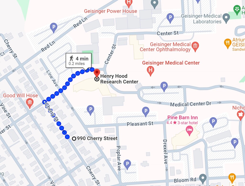 This beautiful home is just few steps to Geisinger. Your view is Geisinger Henry Hood Research Center. 5 Minutes walk to Geisinger hospital door, this furnished single family home offers a 3 bedroom or a 2 bedroom, large office and 1.5 bathroom. Kitchen has recessed lights, granite countertop, tile backsplash, Kraft Made kitchen cabinetry, stainless steel double door refrigerator, dishwasher, microwave with easy access to the laundry area, pantry and half bathroom. This home has gas stove for those who loves to cook. Gas heat and air conditioned. Unit comes with off-street parking in the backyard. Rent includes lawn mowing, bush trimming, fall leaves clean up.