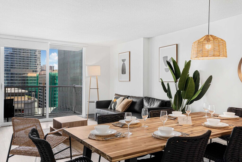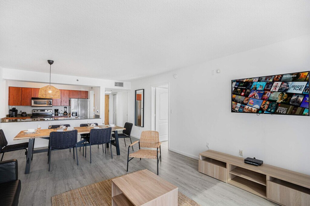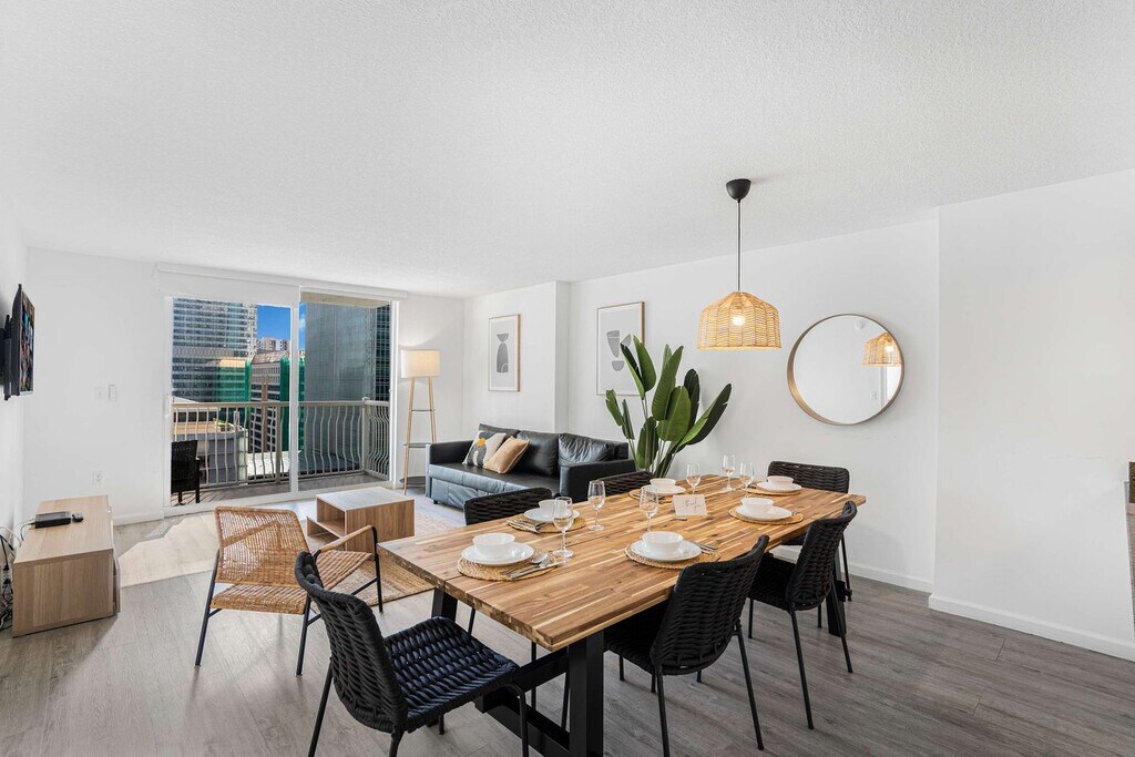 The advertised rate of $5,039/month is the lowest available price, based on a 30 day(s) stay with a move-in date of August 14, 2026. Rates vary depending on the duration of stay, season, and other parameters. For exact pricing and additional pricing components, please visit our website and enter your desired move-in and move-out dates. The rate is applicable when billed upfront; it can be higher if billed in multiple payments. Discover your peaceful oasis in vibrant Brickell with this elegant condo offering stunning skyline views. The calm, modern design is perfect for work or leisure, and its prime location is just steps from Brickell City Centre and Publix. Situated minutes from Wynwood, Design District, and South Beach, and only 15 minutes from Miami International Airport, you'll feel at home with effortless access, comfort, and convenience during your stay. This modern condo is designed for the perfect Miami getaway, featuring two queen-size beds for restful sleep, a spacious living room with a sofa bed and smart TV, a fully equipped kitchen with a dining table for four, and a private balcony with stunning city, pool, and bay views. Enjoy the convenience of an in-unit washer and dryer and one free parking spot. A virtual fob can be purchased at the front desk for approximately $10, available daily from 8 AM to 10 PM. Stay in the heart of Miami’s vibrant financial district, steps from top attractions, dining, and nightlife. Nearby highlights include Brickell City Centre for luxury shopping and fine dining, Mary Brickell Village with trendy cafes and open-air restaurants, and Bayfront Park for waterfront walks and outdoor events. The Kaseya Center and Miami Beach are just a short drive away, making this a prime Brickell location to explore the best of Miami. No parties or loud gatherings are allowed, and violation may result in fines by building management. Check-in is at 4:00 p.m. and check-out is at 11:00 a.m. Late check-out requests require 24 hours' notice and may incur an additional cost. Smoking inside the property is strictly prohibited, with a $300 fine for any evidence of smoking. Quiet hours are from 10:00 p.m. to 8:00 a.m. Please turn off the air conditioning when leaving the unit to maintain an energy-efficient environment. The condo offers a calm, modern design suitable for work or leisure, ensuring a comfortable environment for remote work. [SI]