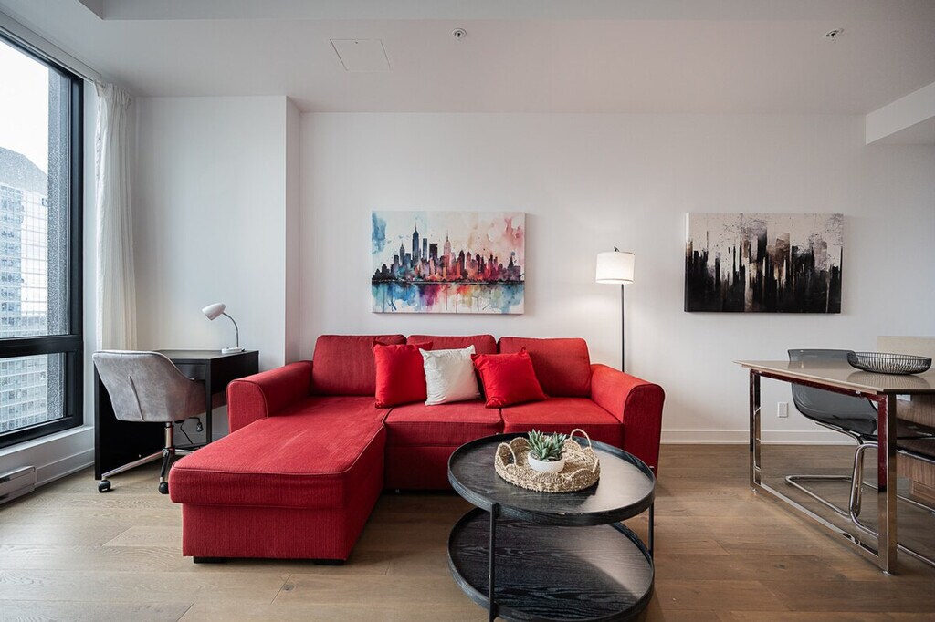 Welcome to a luxurious high-rise in downtown Montreal offering breathtaking city views. Indulge in a spacious unit with one bedroom, one full bath, a private balcony, and expansive 10-foot ceilings that invite natural light through large, sunny windows. This property boasts high-end finishes throughout, coupled with a suite of top-tier amenities. Conveniently located mere steps from Lucien l’Allier metro station, train access, and the underground Montreal network. After visiting some exceptional apartments ourselves, we've strived to make this apartment as welcoming and cozy as we possibly could for our guests. This space welcomes 2 guests. It has 1 bedroom with a queen bed and a full bathroom. Enjoy a Smart TV for your viewing pleasure and stay seamlessly connected with high-speed Wi-Fi throughout your stay. Indoor parking with in and out privileges is available for a separate fee depending on your length of stay. We offer a variety of cleaning services that include biweekly or monthly for an extra charge. Built in 2016, this apartment is in the heart of downtown Montreal with security 24/7. Enjoy a fantastic terrace with swimming pool and BBQ grills, a fitness center, sauna and rain room, and many entertainment rooms. Just steps away from the metro station Lucien l’Allier, train and the underground Montreal network. No parties of any kind or loud noises that can alter the harmony of residents are allowed. No smoking of cannabis, cigarettes, or any kind inside the apartment, balcony, or the building. Care for your home away from home.