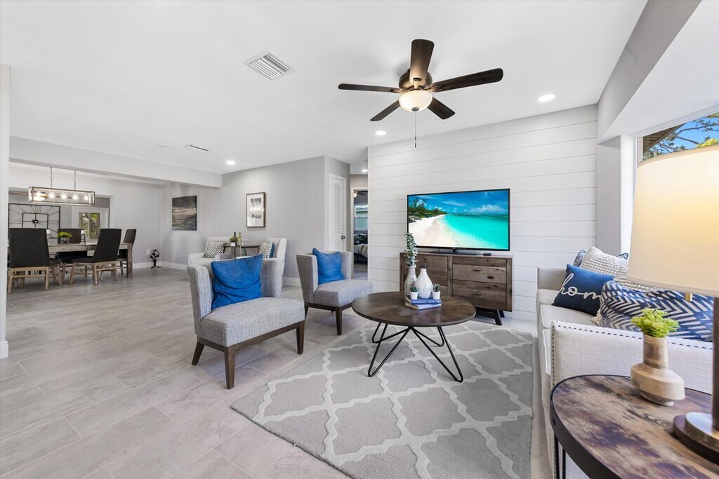 This Gulf Access Waterfront home has just undergone an extensive $100K+ renovation. Highlights of the renovation include New Windows, a New Irrigation System, New Firepit area overlooking the Canal & its Western Rear Exposure, New Exterior/Interior Paint, New 12x24 Porcelain Wood Plank Tile thru out, New Shiplap Walls in the Foyer & Living, New 5” Baseboards, New Fans, Lights, Fixtures, Sinks Faucets, a New Kitchen with White Wood Cabinets with Black Hardware, Quartzite Counters, a Subway Tiled Backsplash, New S/S Appliances & a Custom Tray Ceiling with LED Accent Lighting, New Grey Shaker Vanities in both baths with Custom Designer Tiled Showers with a new tub in the Guest, New Interior Doors, New Electrical Outlets & so much more. Home is located minutes to Cape Coral, Historic Downtown Ft Myers, North Fort Myers High School & just a 15-minute Boat Ride to the River. Home is NOT IN A FLOOD ZONE as its built up.