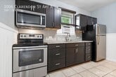 1BR, 1BA, duplex. kitchen with granite counters and stainless steel appliances- stove, microwave &refrigerator. Washer & Dryer provided, Window a/c and central heat . Hardwood floors throughout, Screened front porch, rear yard. This home is both electric and gas.