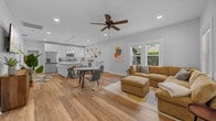 Welcome to Bougie Bungalow, your luxurious mid-century modern getaway in the trendy Seminole Heights neighborhood of Tampa! Feel the modern yet retro vibes throughout this 4-bedroom home, featuring a large fully stocked kitchen, full-sized washer and dryer, work-from-home office space, outdoor grill for BBQs, abundant natural light, and a charming porch swing to enjoy your morning coffee. Whether you're seeking a weekend getaway with friends or a family retreat, this bougie mid-century modern home promises an unforgettable experience. Revel in the beauty of a bygone era while indulging in modern comforts and swanky decor. The 4-bedroom open floor plan bungalow has been updated to provide timeless elegance while fusing funky-fresh decor from the 60s-70s era. The home features a relaxing living room, a cooking lover’s dream kitchen with a massive island for entertaining, and a full master suite featuring a soaking bath and walk-in shower. The bathrooms provide shampoo, conditioner, body wash, a hair dryer, and extra towels, so you’ll be fully set up for a perfect stay. Enjoy fun board games on the TV console bench for a delightful game night. The property includes a dedicated parking spot in the driveway. For those traveling with children, the home offers an incredible set-up including a Pack N’ Play, sheet set, baby bath, changing table, high chair, and silicone plate, fork, and spoon. This home is located in the highly sought-after historic district of Seminole Heights. The quiet cobblestone streets make the perfect place for an evening stroll to a local restaurant or bar. Seminole Heights is known as the foodie district of Tampa and is central to all Tampa has to offer. Guests can take a quick 5-minute drive to Florida Ave., a hot spot for local restaurants, coffee shops, and bars. It's only a 5-10 minute drive to visit Downtown, Channelside, The Port, Armature Works, Straz Center, Amalie Arena, or the Lowry Park Zoo. A further 10-15 minute drive will land you at Tampa International Airport, Busch Gardens International Mall, or Raymond James Stadium. Florida is tropical, and local wildlife, including insects, is common. The home is well maintained and treated regularly to reduce bug encounters, but occasional sightings may occur. There are 3 small stairs to enter and exit this home, which may affect those with special accessibility needs. The property includes a mother-in-law guest house located behind it, but you’ll have complete privacy as you are booking the main 4-bedroom house. You can enter with your personal smart lock code sent to you after booking. Quiet hours are from 11 PM to 8 AM. No smoking inside the home; any evidence of smoking, including vapes, will result in a fee for odor removal, duct cleaning, and furniture cleaning. No parties or events are allowed unless previously approved. Please be considerate of neighbors and maintain quiet hours. The home features dedicated workspaces for those working remotely, equipped with high-speed Wi-Fi and a smart TV with Netflix. A laptop computer is not included.