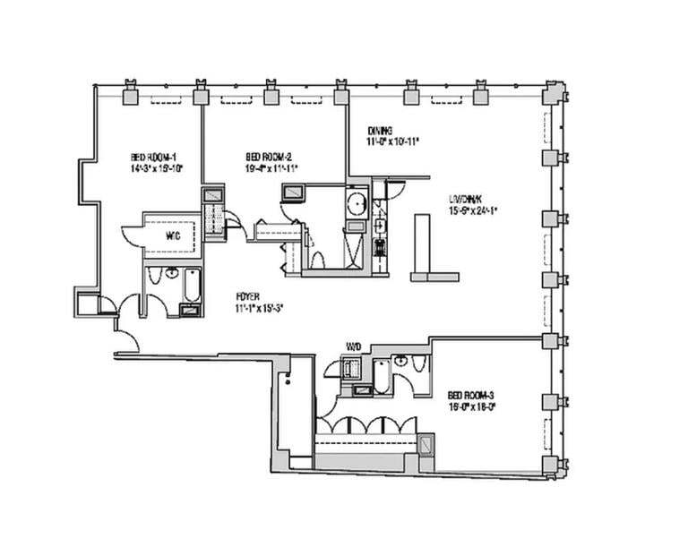 Welcome to this massive Flex 9 residence in a luxury Wall Street building offers an exceptional three-bedroom, three-bathroom layout with incredible space and flexibility. The home features an expansive living and dining area, oversized windows with great natural light, and generously sized bedrooms, including a primary suite with an en-suite bath. A modern kitchen with premium finishes and ample closet space completes the home.Residents enjoy full-service amenities such as a 24-hour doorman, fitness center, and resident lounge, all in the heart of the Financial District near major subway lines, dining, and shopping.