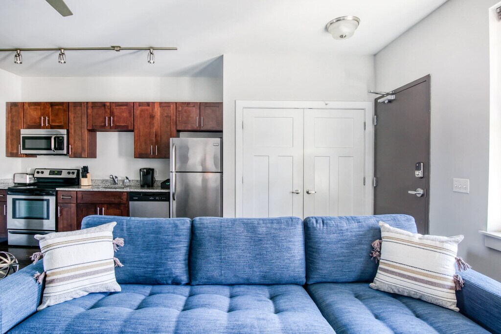 Feel at home in this locally inspired condo in Nashville's Music Row and Midtown. This wheelchair-accessible condo is steps away from shopping, dining, and live music. This condo is suitable for families, groups of friends, or business travelers. It features a fully equipped kitchen, 100mbps+ internet, modern decor, a Smart-TV with streaming apps installed, a garden area to lounge and relax with friends, and complimentary coffee. Enjoy access to a community garden with a cabana, two outdoor TVs, a gas grill, and a fire pit. One complimentary parking spot is included. Additional pet fee of $100-300 based on stay length will be collected separately. There are many places within walking distance of the building in Music Row. Old Glory and Bella Napoli are some local favorites. Midtown bars are within walking distance, and Lyft/Uber to Broadway (Downtown Nashville) and the famous Honky Tonks are only $5-7 one-way. Smoking of any kind is not permitted within or outside of the condo, including balconies, patios, or common and/or parking areas. Any sign of smoking is a violation of the stay agreement, which may result in immediate termination and recovery fees beginning at $500. There is a $500 penalty for removing smoke detectors and a $200 penalty for lost key fobs. No outside guests are allowed without permission. Guests must agree to not disturb neighbors at all times during the stay and must observe quiet hours from 9pm-8am each day. Check-in is at 4 PM and check-out is at 11 AM, with a $75/hr late fee. Maximum of two pets are allowed (40lbs combined), excluding Pit Bulls and Bull Mastiffs (or similar breeds). A pet fee may be charged for guests traveling with an emotional support animal. Weapons and drugs are not allowed, and police will be called for violating this rule. [SI]
