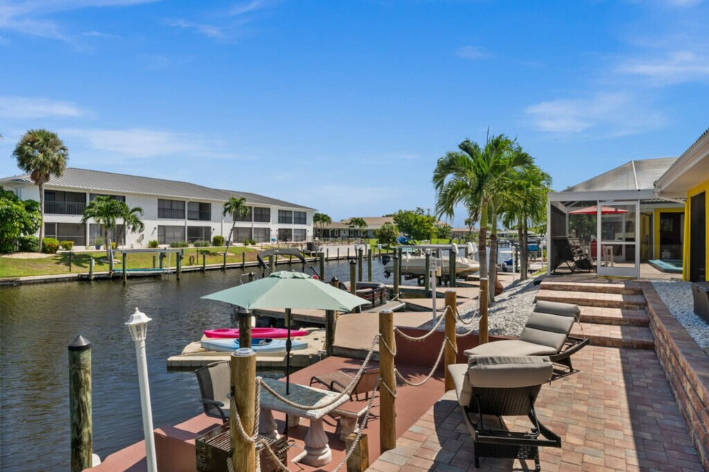 Feel at home in this stunning 3-bedroom, 2.5-bath condo at Seatuit Boat & Beach Club, offering a luxurious waterfront vacation experience. This elegantly appointed condo features new furnishings and modern amenities. Enjoy the spacious open floor plan, a heated saltwater swimming pool steps from your patio doors, a private outdoor gas grill, and a spacious bar/lanai area perfect for alfresco dining and entertaining. A private dock is ideal for fishing or launching your boating adventures. A private boat slip is available. Situated directly on the scenic Rubicon canal, you'll enjoy stunning water views and instant access to your private boat slip. This centrally located apartment is just 2 miles from both Cape Coral's vibrant entertainment district and the beautiful Yacht Club beach, and minutes away from top-rated restaurants, shopping, lively bars, and entertainment venues. No smoking is allowed inside the condo or screened pool areas, but outdoor smoking areas are provided. Quiet hours are from 10 PM to 8 AM. [SI]