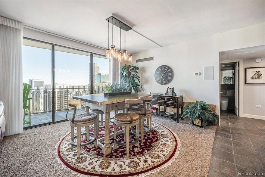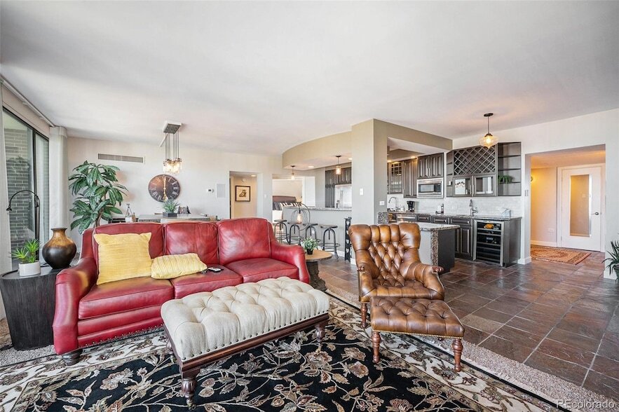 Experience the pinnacle of urban luxury in Penthouse 42C at 1020 15th Street, a contemporary, remodeled residence in the iconic Brooks Tower. Located in the heart of Denver's Theater District, this exclusive 42nd-floor retreat offers stunning views of the Downtown Denver skyline from three private balcony and terrace spaces. Step into the expansive entry foyer, which opens to a light-filled living space with spectacular panoramic views. The modern open-concept living room, kitchen, and dining area is a masterpiece of design, featuring a built-in sound system with ambient controls for the ultimate atmosphere. The kitchen boasts walnut cabinets, stainless steel appliances, a wine cooler, granite countertops, a large island with bar seating, and pendant and recessed lighting. Dine in style with formal seating overlooking the Denver skyline, accented by elegant pendant lighting. Enjoy the convenience of electric blinds that adjust from sheer for natural light to full coverage for privacy. The luxurious primary suite is a private sanctuary, featuring a sunrise-facing balcony, a massive walk-in closet with in-unit laundry, and a spa-inspired 5-piece bath. The en-suite bath includes a large glass-brick shower that floods the space with natural light. The second bedroom is equally well-appointed, offering a private bath with a remodeled shower, white tile with accent details, and polished nickel fixtures. A versatile bonus flex room spanning over 350 square feet opens to an expansive terrace, currently serving as a guest bedroom with a queen-size Murphy bed. This space provides endless possibilities for entertaining or relaxing. Situated in the heart of Denver, Brooks Tower offers unparalleled amenities, including a fitness center, outdoor pool, and 24-hour concierge service. Enjoy unmatched access to the city's cultural attractions, fine dining, and vibrant nightlife. Don t miss this rare opportunity to own a truly spectacular penthouse with exclusive 42nd-floor living.