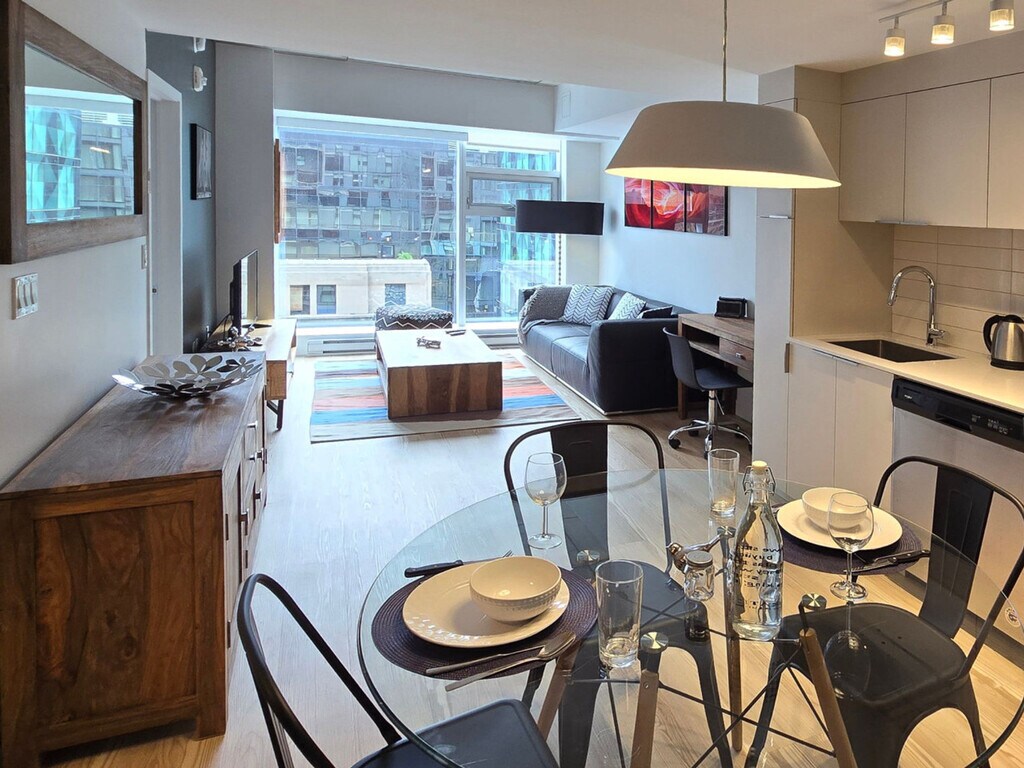 The advertised rate of C$3,872/month is the lowest available price, based on a 30 day(s) stay with a move-in date of January 5, 2027. Rates vary depending on the duration of stay, season, and other parameters. For exact pricing and additional pricing components, please visit our website and enter your desired move-in and move-out dates. The rate is applicable when billed upfront; it can be higher if billed in multiple payments. Feel at home in this furnished serviced 1-bedroom apartment at Humaniti, located in the heart of Montreal’s international district. This south-facing apartment offers abundant natural light and approximately 557 square feet of living space. The kitchen is fully equipped with essential appliances, cookware, and utensils. The open-concept living and dining area is complemented by deluxe bedding, linens, and towels. Enjoy the convenience of an in-suite washer and dryer, self-regulated air conditioning and heating, unlimited high-speed wireless internet, and Smart TVs. Parking is available for an additional fee, and pet-friendly options are available with restrictions and additional fees. Steps from the Quartier des Spectacles, Old Montreal, and Place Jean-Paul-Riopelle, this centrally located apartment is near metro stations, art venues, restaurants, and year-round cultural events, perfectly blending convenience and urban sophistication. Part of a wellness-focused, sustainably built community, this apartment emphasizes air, water, and light quality while promoting comfort, energy efficiency, and overall well-being. A Notice to Vacate must be sent to us in writing 30 nights before the departure date. Failure to do so will result in a charge of 30 nights (only valid for stays over 30 nights). Reservations can be extended with 30 nights notice and are always subject to availability and rate variances. A separate workspace is available in most suites. [SI]