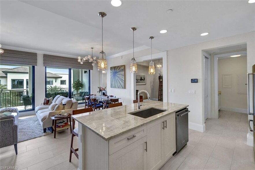 Discover the pinnacle of urban living in this immaculate Naples Square Penthouse residence, ideally situated in the downtown Naples Design District. Meticulously curated by design professionals, this turnkey furnished home offers a seamless blend of location and luxury. Recently refreshed with new, like-new furnishings, the interior showcases an inviting neutral palette complemented by sophisticated tile flooring that seamlessly extends to the outdoor lanai, enhancing the sense of space and style. Eclectic contemporary light fixtures further accentuate the elegance of each room.Noteworthy features include custom motorized shades in the living area windows and plantation shutters in both bedrooms. The residence also boasts a stunning custom etagere bridging the foyer and kitchen, upgraded quartz countertops in the kitchen and bathrooms, custom closet cabinetry, and additional built-in storage in the laundry area. Step onto the quiet and serene lanai, offering views of a lush tropical oasis, ideal for relaxation and unwinding amidst nature.Residents of Naples Square enjoy a tranquil courtyard oasis featuring a pool, hot tub, fire-pit area with ample seating, a grilling and dining area, and a covered built-in bar perfect for outdoor gatherings. Enjoy the convenience of being steps away from the renowned restaurants and boutique shops of 5th Avenue, the coastal allure of Bayfront, the new AC Marriott Hotel with the captivating Limon Rooftop Bar, the recently inaugurated Gulfshore Playhouse, and a wide array of other attractions. Embrace pet-friendly luxury living at its finest in this exceptional Naples Square Penthouse.
