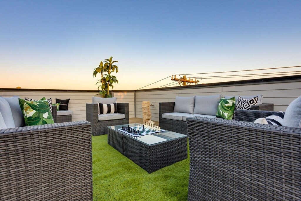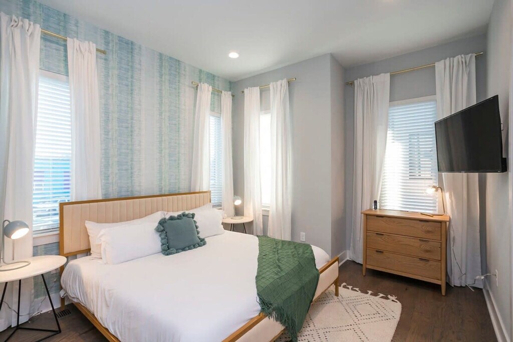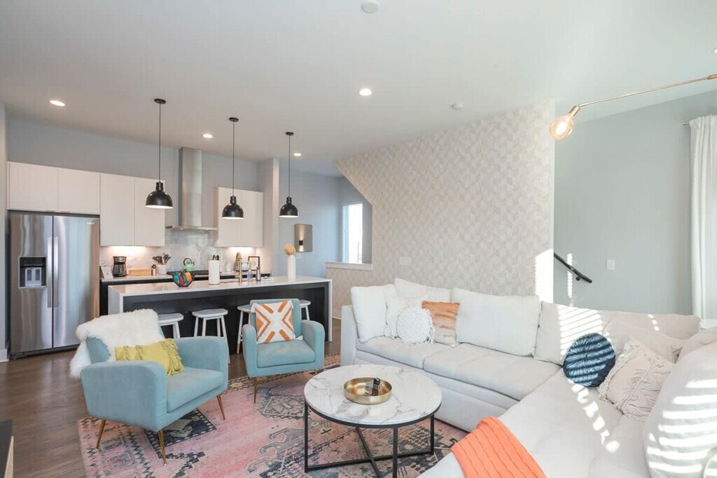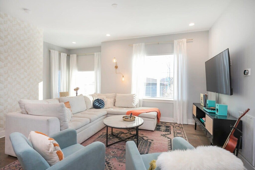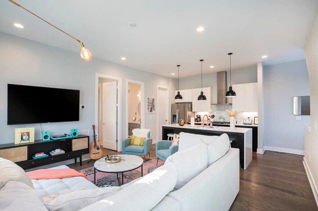 Experience the vibrant energy of Nashville from this fabulous three-story townhouse, complete with a rooftop deck offering stunning skyline views. This spacious four-bedroom, four-bathroom home is perfect for groups, families, or business trips, featuring plush beds, smart TVs, and a fully stocked kitchen. Located in one of Nashville's fastest-growing neighborhoods, you'll be within walking distance to the Nashville Farmer's Market and just a short Uber or Lyft ride to downtown attractions like Broadway, Bridgestone Arena, and Nissan Stadium. This newly furnished townhouse boasts an open and fun space, ideal for any gathering. The fully stocked kitchen includes an island with barstools and a workstation/bar with leather seats. The spacious living area features a custom mural, providing a unique backdrop for relaxation or entertainment. The rooftop deck is a highlight, perfect for watching the sunrise and sunset over the city. The property offers a single-car garage and free on-street parking. For guests staying three weeks or longer, an additional cleaning fee of $215 will apply. Optional concierge services are available upon request, including a stocked refrigerator and in-home chefs. Nestled in Nashville’s newest up-and-coming neighborhood, this townhouse is conveniently close to a variety of bars, restaurants, grocery stores, and shopping options. With easy access to Marathon Village, The Gulch, 12 South, and midtown, you'll be less than three miles from the iconic honky-tonks of Broadway and Bridgestone Arena. Lyft and Uber are readily available for quick and affordable transportation. Decorations may not be adhered to the walls, fixtures, or furniture, with a fine imposed for violations. Additional guests outside of the confirmed guest count are not allowed unless pre-approved, with a $500 fine for exceeding the guest count. Exterior cameras are in place for security. Guests are advised to ensure all doors are shut and locked when not in use and to avoid leaving valuables in vehicles parked on the street. Guests staying three weeks or longer will incur an additional cleaning fee of $215. The primary guest must be 21 years or older, and photo ID information must match the credit card used for booking. The townhouse provides plenty of workstations throughout, making it remote work-friendly. A laptop computer is not included. Registration Number: