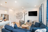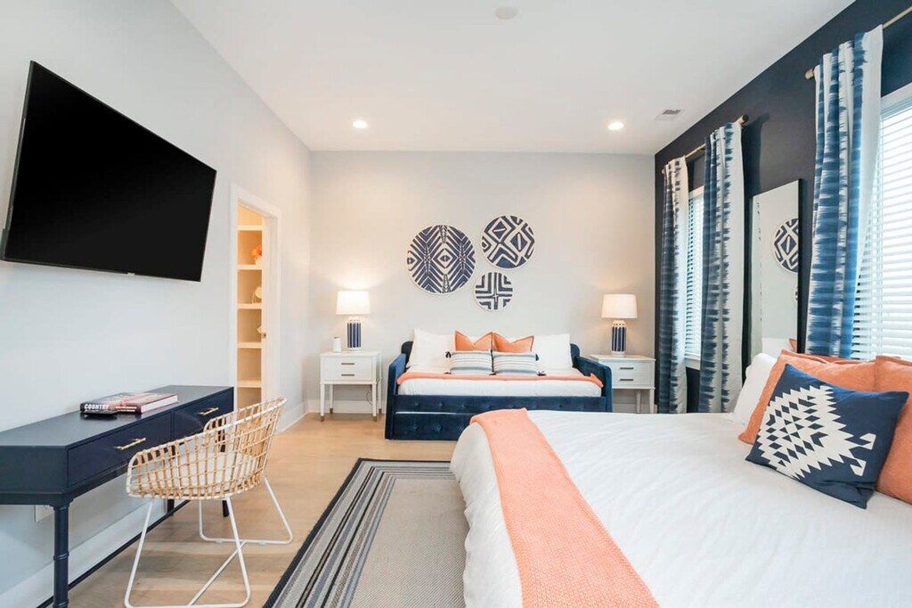 Experience the heart of Nashville with this luxury townhouse retreat, featuring a stunning rooftop deck with city views. Located just minutes from Broadway's vibrant scene, this spacious townhouse offers four bedrooms and four bathrooms, a fully stocked kitchen, plush beds, and hotel-like amenities. Smart TVs and ample space make it perfect for large groups. Enjoy the convenience of being within walking distance to Nashville Farmers’ Market and a short ride to downtown attractions, including Top Golf just a mile away. The townhouse is thoughtfully designed across multiple levels. The first level includes a bedroom with a queen bed, desk, and TV, along with a full bathroom featuring a walk-in shower. On the second level, you'll find another queen bedroom with an en-suite full bathroom, a brand new fully stocked kitchen with an island and barstools, a custom-built dining nook, and a spacious living area adorned with a custom Music City mural and two TVs. The third level houses a king bedroom with an en-suite full bathroom, another king bedroom with twin trundles, a TV, and a desk, along with an adjacent full bathroom with a walk-in shower. The rooftop deck offers plenty of seating and views of downtown. Optional concierge services are available upon request, including a stocked refrigerator and in-home chefs. Guests staying three weeks or longer will incur an additional cleaning fee of $200, which is not included in the initial pricing. Situated in Nashville’s newest up-and-coming neighborhood, this townhouse is in close proximity to many bars, restaurants, grocery stores, liquor stores, fitness centers, and shopping venues. A short ride will take you to Marathon Village and popular neighborhoods like The Gulch, 12 South, and Midtown. The property is less than three miles from Bridgestone Arena and the honky-tonks of Broadway. With a single-car garage and free on-street parking, getting around is easy with Lyft and Uber readily available. Decorations may not be adhered to walls, fixtures, or furniture, and failure to comply will result in a fine. Additional guests outside of the confirmed guest count are not allowed unless pre-approved, and exceeding the guest count will result in immediate eviction and a $500 fine. The property has exterior cameras to verify entries. Guests are advised to ensure all doors are shut and locked when not in use and to avoid leaving valuables in vehicles parked on the street. Guests must be 21 years or older, and photo ID information must match the credit card used for booking. Registration Number: