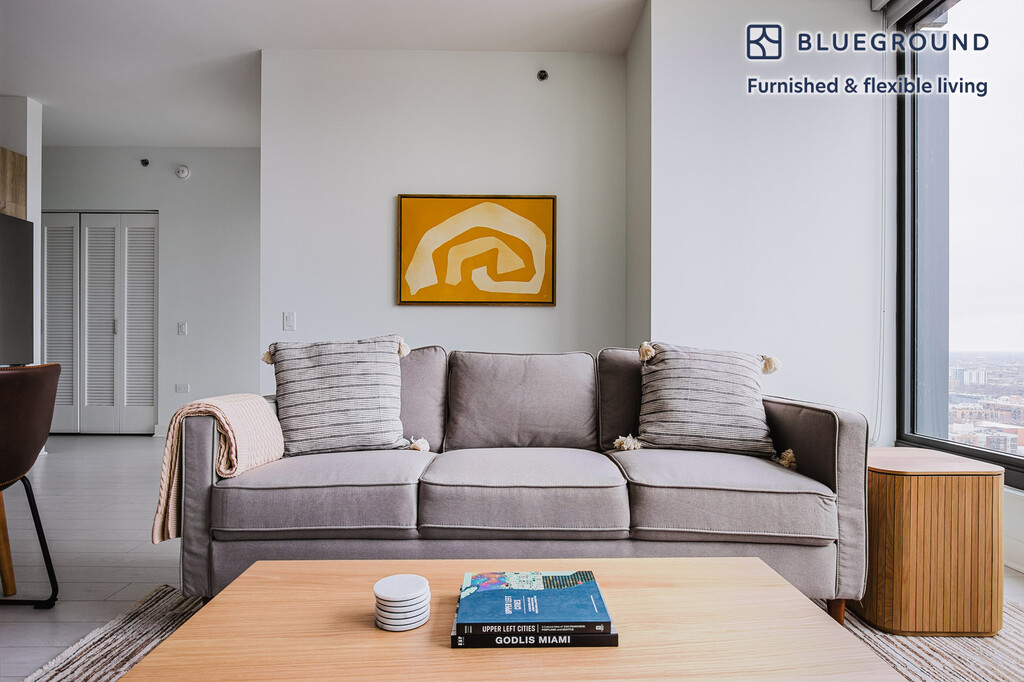 Feel at home wherever you choose to live with Blueground. You’ll love this stylish West Loop furnished two bedroom apartment with its modern decor, fully equipped kitchen, and cozy living room with great high floor views. Ideally located, you’re close to all the best that Chicago has to offer! (ID #CHI1166) The advertised rate of $3,730/month is the lowest available price, based on a 12 month(s) stay with a move-in date of May 11, 2026. Rates vary depending on the duration of stay, season, and other parameters. For exact pricing and additional pricing components, please visit our website and enter your desired move-in and move-out dates. The rate is applicable when billed upfront; it can be higher if billed in multiple payments. Brokers are welcome to reach out. Were you looking for an unfurnished lease? Try Blueground instead and upgrade from unfurnished to furnished living: - Furnished at rates comparable to unfurnished - No setup or furniture costs - save thousands - Move-in ready - save time, just bring your suitcase Designed with you in mind Gorgeous furniture, fully equipped kitchen, smart TV, and a premium wireless speaker are just a few of the amenities you’ll find inside this two bedroom apartment. Ideally located in Chicago, you’ll find a lot to love outside as well. When you’re ready to relax, you’ll be happy to discover every Blueground bedroom comes with superior quality mattresses, luxury linens, and cozy towels. We handle everything so you can simply show up and start living. This apartment also offers in-apartment laundry. Sleeping arrangements King Bed, 70.8in/180cm King Bed, 70.8in/180cm Amenities Building amenities unique to this two bedroom apartment include an on-site: - Doorman - Dryer - Elevator - Swimming pool - Washing machine - Lounge - Library - Pets allowed Arrival and ongoing support The entire apartment is yours to enjoy! Throughout your stay, you’ll have access to our Client Experience team through the Blueground App. You can schedule additional cleanings, submit maintenance requests, and view our neighborhood recommendations with just a few taps. We’ll share all details upon confirmation of your stay. Ideally Located Located in West Loop, this furnished rental invites you to explore the edges of downtown Chicago. From endless dining and bar options to art galleries and stylish shops, West Loop has emerged with so much to offer daily. During weekends, residents savor trips to the Chicago French Market and the vibrant strip of Randolph Street. The latter is known as “Restaurant Row” and is lined with some of the city’s best eateries. Fulton Market, one of the hippest and fastest-growing neighborhoods, is ideal for dinner and drinks. Union Station is only a 5 to 10 minute walk away. Other things to note Building amenities may have an extra cost. This Blueground apartment has flexible lease options, allowing you to book it for one month, a year, or more. Pets are welcome, though weight limits and breed restrictions apply and may incur fees. We take great pride in ensuring every photo displayed is shot in our own units with our actual furnishings. That said, we regularly refresh our decor and furniture arrangement, which may differ from what’s pictured. Also note - This apartment is located near a railway, so expect to hear moderate noise when trains pass - This is a guarded building equipped with a doorman/concierge at all times [SI]