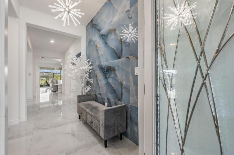 Property Id: 2281311 LUXURY MODEL HOME WITH + $50K in UPGRADES + DOUBLE CORNER LOT! Welcome to resort-style, maintenance-free living in the exclusive 55+ gated community featuring private amenities along with access to Florida's 15-acre Crystal Lagoon! This stunning 2-bed | 2-bath + flex room home (1,968 sq. ft) is situated on a rare double corner lot with serene pond views. When you enter the home through the 8-foot etched glass door, you encounter beautiful 40"x 40" porcelain tiled floors. The foyer has a porcelain tile signature wall with a modern chandelier. The open concept living and dining areas create a welcoming atmosphere with plenty of natural light. The kitchen features a large island with quartz countertops, a custom porcelain tile backsplash, and a large walk-in pantry. Step outside through the 3-panel glass sliding doors onto your screened lanai with a pond view. It is a perfect spot for morning coffee. Shades have been installed on the lanai. The primary suite serves as a peaceful retreat, complete with a walk-in closet, en-suite bathroom upgraded with dual vanities, frameless, adjustable LED vanity mirrors, and a custom porcelain-tiled walk-in shower with 2 shower heads, including a rainfall shower head. The laundry room is spacious and is connected to the primary bedroom's walk-in closet. The guest bathroom has floor-to-ceiling porcelain tile with a LED Spa Shower Tower, a rain and waterfall head, and four massage body jets. The home also features upgraded modern lighting, ceiling fans, and a brick-paver driveway. Enjoy resort-style living at The Medley in Mirada, which includes a clubhouse, restaurant, fitness center, pool, pickleball, and tennis courts.