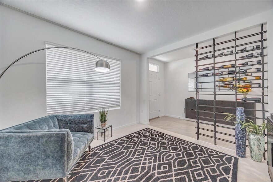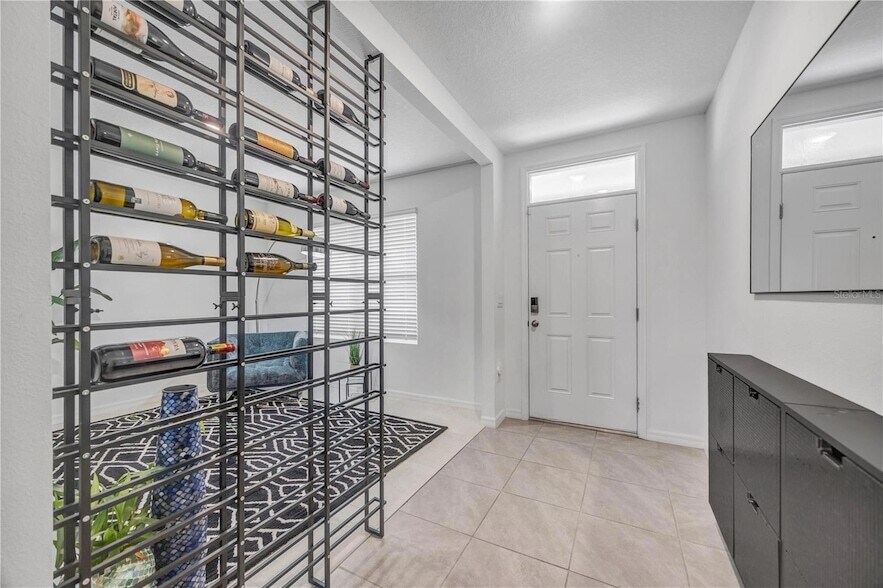 BIG LANAI WITH TRAVERTINE FLOORS, POND VIEW, FENCED YARD, AND LAWN + PEST CONTROL INCLUDED! This spacious 5 bedroom, 3 bath home in the Mirada community offers room for everyone with a functional and comfortable layout. The open-concept downstairs features a bedroom and full bath on the first floor, perfect for multi-generational living, guests, or a private office space. Upstairs you'll find the large primary suite along with three additional bedrooms, all generously sized. Step outside to the extended covered lanai overlooking a peaceful pond view and fully fenced backyard, creating the perfect spot for relaxing or entertaining. The home also includes a washer and dryer, water softener system, alarm system, plus lawn maintenance and pest control included, making day-to-day living simple. Located in Mirada, you're close to shopping, dining, and major roadways while enjoying one of the area's most sought-after communities. *The following will stay in the home living room structure, entry storage for shoes, wine rack, mirror in bedroom 5.*