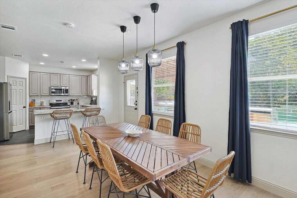 Welcome to this stunning colonial-style vacation home, a true gem that promises an unforgettable getaway. With five bedrooms and 2.5 bathrooms, this spacious retreat can comfortably accommodate up to 16 guests. Enjoy the luxury of an outdoor swimming pool and jacuzzi, along with a dedicated cinema room, all designed to make you feel at home. Step into a modern, airy, and sophisticated space that invites relaxation from the moment you enter. The fully equipped kitchen, complete with stainless steel appliances and granite countertops, is a delight for any home chef. The open-concept living and dining areas, adorned with modern decor, provide a welcoming atmosphere for entertaining and enjoying quality time with loved ones. Guests can enjoy free parking with ample space in the driveway and garage, as well as additional street parking if needed. This pet-friendly home welcomes house-trained pets with a non-refundable fee of $150 per pet, with a maximum of two pets per stay. An additional nightly rate applies for more than six guests, and pool towels are not provided, so guests are encouraged to bring their own. Nestled in the charming town of Saginaw, this home offers a small-town feel with big-city amenities. Explore nearby attractions such as Eagle Mountain Park, Saginaw Heritage Square, and the Airborne Trampoline Park, all within a short drive. For those looking to venture further, the vibrant Dallas-Fort Worth area is easily accessible, offering cultural landmarks and entertainment options. This property maintains a strict no-smoking policy, with violations subject to a $450 fine plus cleaning and repair costs. Check-in is at 4 PM and check-out is at 10 AM. While parties and large gatherings are not allowed, small gatherings may be permitted with prior approval. A noise monitoring device is installed to ensure compliance with local noise ordinances, though it does not record or store sound data. Stay connected with high-speed Wi-Fi throughout the home, making it easy to work remotely or stream your favorite shows on the smart TVs equipped with popular streaming apps. Registration Number: 54104 [SI]