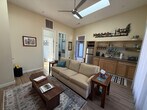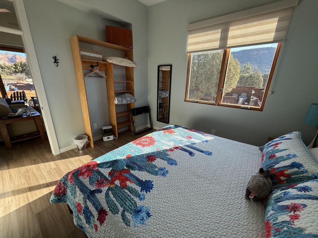 Feel at home in this meticulously curated 1-bedroom casita in Red Canyon, built in 2020 and offering 400 sq ft of comfortable living space. Every detail has been intentionally selected, from custom finishes and hand-built shelving to southwest-inspired pieces. The kitchenette includes a microwave, toaster oven, 4-cup drip coffee maker, tea kettle, medium-size fridge with freezer, and cookware and dinnerware for two. The bathroom features 10-foot ceilings, a walk-in glass panel shower, a single vanity, a hair dryer, an iron and ironing board, plus an in-unit washer and dryer. Amenities provided at arrival include toilet paper, facial tissue, paper towels, dish soap, sponge, laundry detergent pods, fabric softener sheets, Lather luxury bath products (shampoo, conditioner, body wash, lotion), and large and small trash bags. Entertainment is provided by a 65" internet-ready TV (streaming only) and a Bluetooth speaker. Guests can easily control the indoor temperature with the central air conditioning system. Enjoy the outdoor patio with a wood-burning clay chiminea and the complimentary Red Rock Pass. Located in Rancho Rojo Estates, a quiet neighborhood in the Village of Oak Creek, the area is ideal for stargazing and evening walks. The Collective (dining and shops, Tesla and Rivian Charging Stations) is a 2-minute drive or 10-minute walk away. Clark’s Market is 1.5 miles away, and Sedona Golf Resort & Oakcreek Country Club are a 7-minute drive away. Hiking and biking trails nearby include Bell Rock Pathway (1.5 mi), Slim Shady Trail (1.4 mi), Transept Trailhead (2.1 mi), and Baldwin Trailhead (4.5 mi). Smoking and pets are not allowed. [SI]