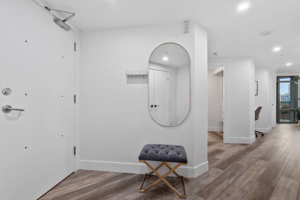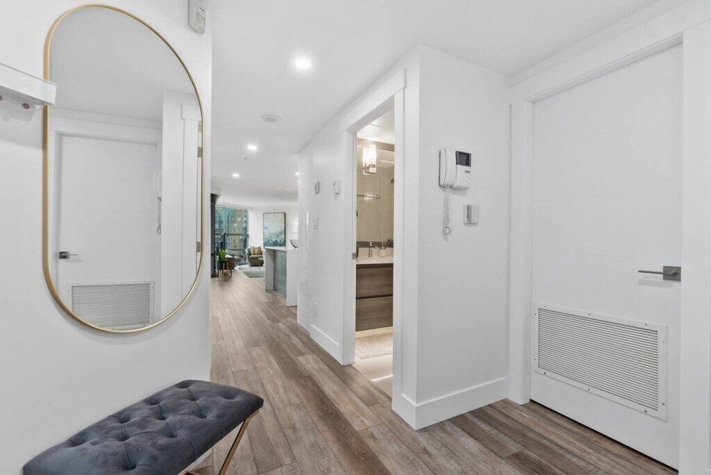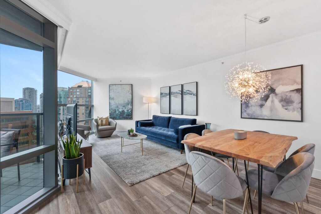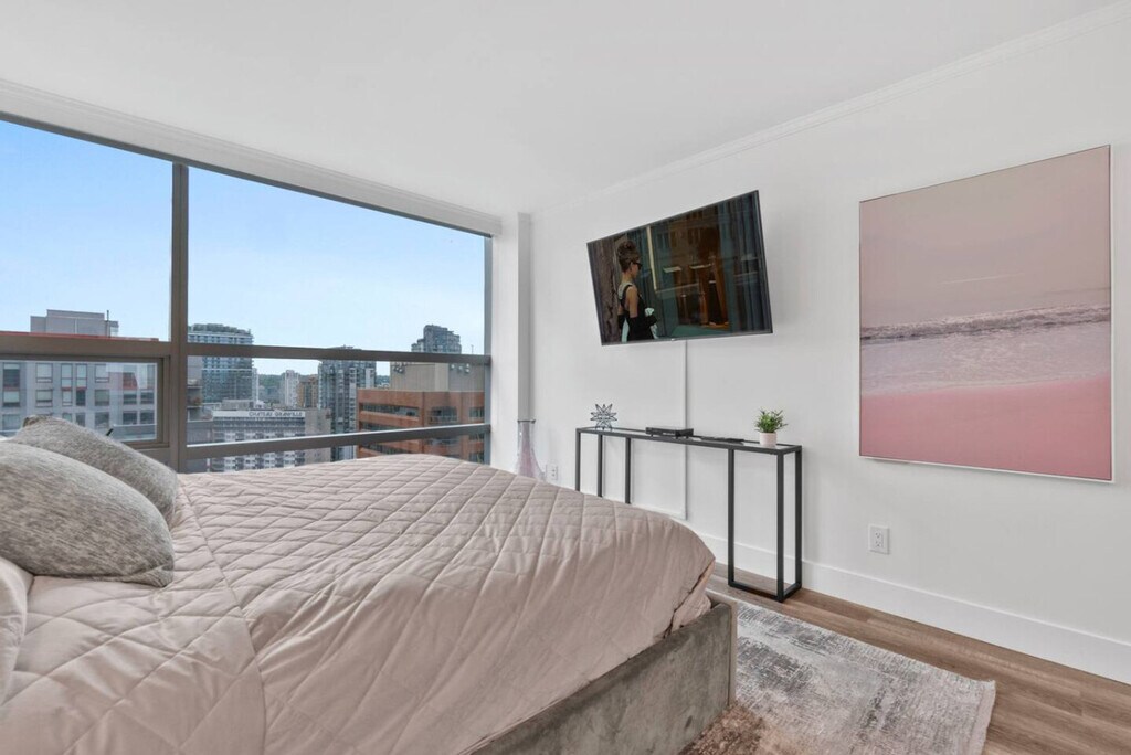 Experience modern city living in this stylish 2-bedroom, 2-bath condo in the heart of downtown Vancouver. Located on Burrard St, this home offers comfort, convenience, and unbeatable access to the city’s best. The condo features a sleek open-concept living area with floor-to-ceiling windows, a fully equipped kitchen, and a private balcony with sweeping views of the city skyline, making you feel at home. No smoking and vaping, no parties and events, and no noise after 10pm. [SI]