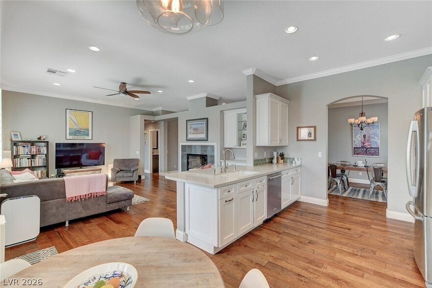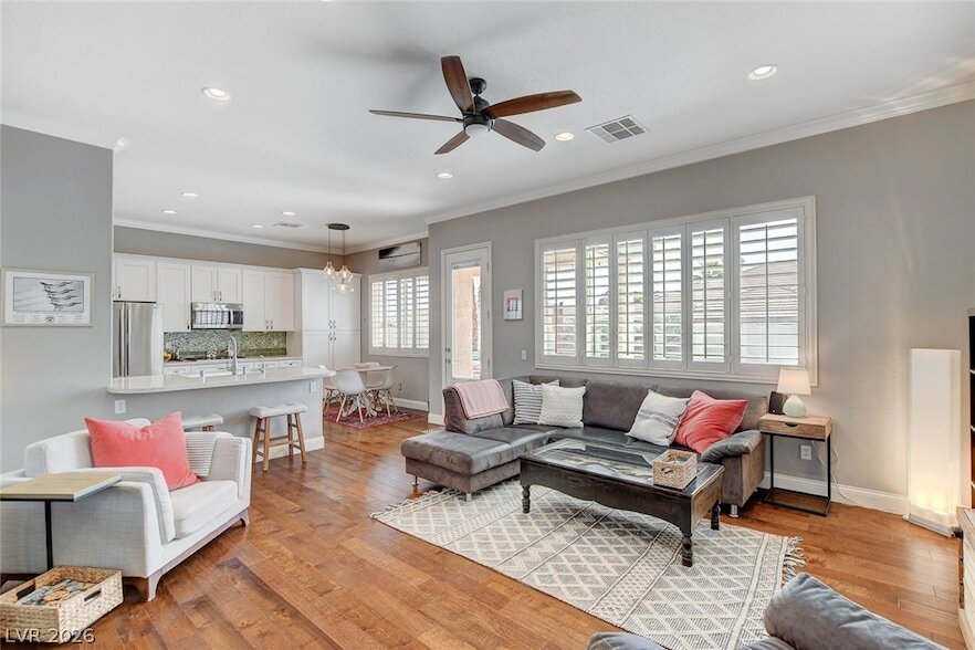 Gorgeous single-story 5-bedroom home in Summerlin with a sparkling pool and spa. This beautifully upgraded property features tile and engineered hardwood flooring throughout, along with a spacious island kitchen complete with quartz countertops, stainless steel appliances, and soft-close cabinetry. Enjoy formal living and dining rooms in addition to a separate family room, offering plenty of space to entertain. The primary suite includes custom closet cabinetry and a luxurious bathroom with a separate tub and shower, custom backsplash, and walk-in closet. Additional highlights include ceiling fans, shutters, and built-in garage cabinets for extra storage. Step outside to a covered patio and a fully landscaped backyard with artificial grass, a built-in BBQ, and a gas fire pit perfect for relaxing or hosting guests. Pool and yard services are included for easy, low-maintenance living.