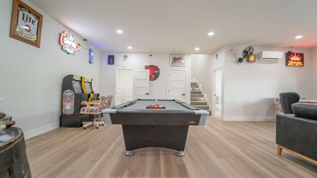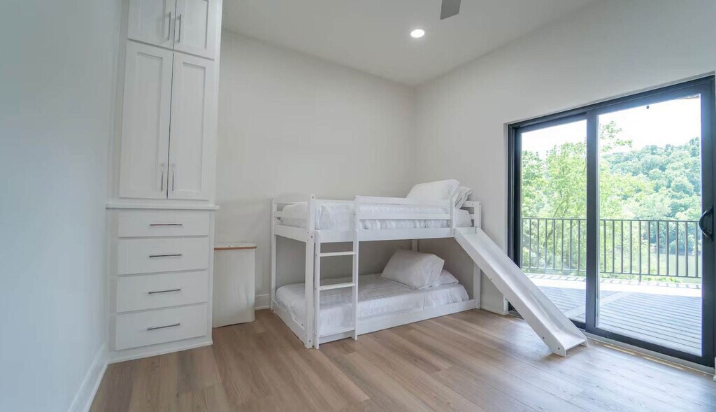 Experience the ultimate lakeside retreat with this stunning multi-level home offering private lake access for swimming and kayaking. Relax under the stars in the hot tub or enjoy the game room featuring a pool table, shuffleboard, arcade games, and big-screen TVs. The chef’s kitchen is fully equipped with modern appliances and island seating, perfect for entertaining. With three king suites, a bunk room, and a loft with a trundle, this home comfortably sleeps 13, making it ideal for gatherings and special events. This luxurious home spans four levels, each offering breathtaking views and ample space for relaxation and fun. The main floor features a vaulted living area with a fireplace that opens to a lake-view deck, alongside a fully equipped chef’s kitchen with island seating. The lower level includes a bunk room and a game room, leading to a patio with a hot tub and fire pit. The third level houses two king bedrooms, while the fourth-level loft is perfect for kids with twin beds and a trundle. With decks on every level and generous common areas, there’s plenty of room to gather or find your own quiet nook. This property welcomes up to two housebroken dogs over one year old with a fee, while cats are not permitted. Events are considered on a case-by-case basis with prior approval and an extra fee. Ample private parking is available for guests, ensuring convenience during your stay. Nestled in the serene surroundings of Northwest Arkansas, this home offers peace and privacy while being conveniently close to essential amenities and attractions. Located approximately 17 miles from Northwest Arkansas National Airport, 12 miles from Walmart Supercenter, and 11 miles from Downtown Rogers, you’ll have easy access to shopping, dining, and entertainment. Enjoy outdoor adventures at Hobbs State Park, just 5 miles away, or explore the Pinnacle Hills Promenade, 16 miles from your doorstep. Smoking is permitted outdoors only if cigarette butts are properly disposed of. Quiet hours are from 9 PM to 8 AM to maintain a peaceful environment for neighbors. Children must be supervised around the lake, balconies, and hot tub. Starter supplies such as toilet paper, paper towels, and basic toiletries are provided, but for extended stays, additional supplies may be needed. A seamless and enjoyable stay is ensured with hassle-free check-in via a smart lock door code provided 24 hours before arrival. While your privacy is respected, assistance and local recommendations are just a message or call away, ensuring quick support whenever needed. [SI]
