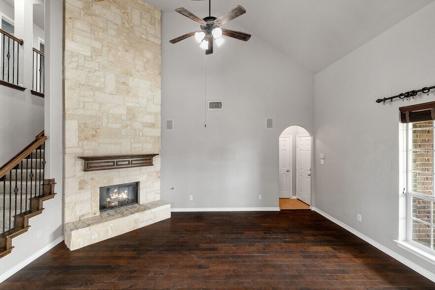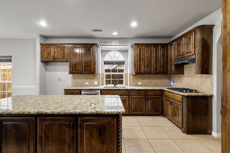 Immaculate 2010-built home in desirable Dominion at Panther Creek with POOL, 3 CAR GARAGE, FRISCO ISD! Hard to find 5 bedroom home with study, media room, 3 car garage & pool located across from Tadlock elementary school & greenbelt. Gorgeous drive-up appeal. This home has an open floorplan, two story family room, high-end finish out, wood flooring throughout most of the first floor, and new carpet! Stylish primary retreat features wood floors, sitting area, jetted tub & granite countertops. Eat-in kitchen has granite island, knotty alder cabinetry, stainless steel appliances, gas cooktop, butler's pantry. Two-story family room features floor-to-ceiling stone fireplace, wood floors, and has view of the pool. Beautiful outdoor retreat features spacious covered porch, recently re-surfaced pool, side yard with artificial turf. Home is ready for immediate move-in.