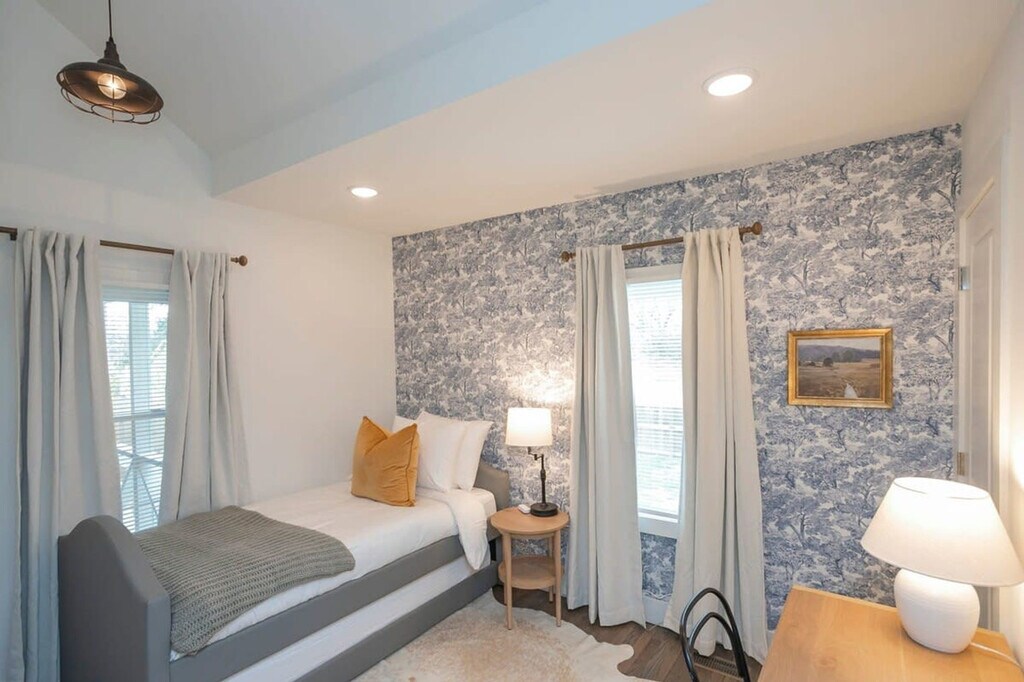 Experience the charm of Donelson with this exquisitely designed home, nestled in the rolling countryside just 15 minutes from downtown Nashville. Located a mere 5 minutes from BNA airport, Gaylord Opryland Hotel and Convention Center, and several major shopping centers and restaurants, this "boho chic" home offers a perfect retreat after a day of exploring the city. With exposed beams, custom millwork, a covered porch, and a private backyard, you'll feel at home in this serene setting. Step into this beautifully redesigned 2-bedroom, 2-bathroom home in the hip area of Donelson. The single-story gem combines modern and rustic accents, offering all the modern amenities you need. The main bedroom features a king-size bed with a memory foam mattress, a walk-in closet, and an en-suite bathroom with a walk-in shower and double sinks. The second bedroom includes a twin trundle bed with memory foam mattresses and a desk area. The living room provides a queen sleeper sofa, ample seating, and a smart TV. Enjoy meals at the dining table or the island with stools, and relax on the covered porch with outdoor furniture, including a dining table, chairs, and a love seat. A stacked washer and dryer are also available for your convenience. The home comes with a large parking area with ample parking for guests. Lyft and Ubers are available and are affordable options to get around. Hugging the Cumberland River, suburban Donelson is home to the famed Grand Ole Opry country music hall and the adjacent Opryland resort and shopping malls. Just 10 miles east of downtown, the area features hip Southern eateries, craft beer pubs, and a seasonal Friday farmers’ market with artisanal eats and live music. A greenway trail bisects the sprawling Stones River Bend Park, and Cooter’s museum celebrates “The Dukes of Hazzard.” Smoking is not allowed inside the property, and pets are prohibited due to severe allergies. The home is not suitable for major parties, but small celebrations with up to 12 guests are allowed. Decorations must not include glitter or confetti, and any damage from decorations may result in charges. Please leave the house in the condition you found it, as the cleaning fee does not cover excessive mess. Communicate any damages during your stay, as excessive mess or damage may result in withholding of deposit. Respect the neighborhood by keeping exterior noise levels down at all times. Illegal internet use, such as downloading or file sharing, is prohibited and may result in fines. Early check-ins or late check-outs must be pre-arranged and may incur additional costs. Be vigilant with property security, ensuring all doors are locked when not in use. Guests staying longer than three weeks will incur an extra cleaning fee. The primary guest must be 21 years or older, and photo ID must match credit card information. Registration Number:
