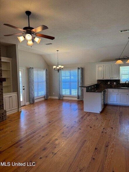 Beautiful pine floors in the entire front of house. Large kitchen, there is plenty of space at the eat at bar. Lots of cabinets and storage for the cook, this kitchen is open and inviting . Living room is beautiful gas log fireplace and built-in cabinets. The split plan features carpet in bedrooms, spacious guest bath and great colors throughout! The master suite is large with a great master bath. And to top it all off, there is a huge covered patio out back, accompanied by a perfect size back yard, with full wooden fence.