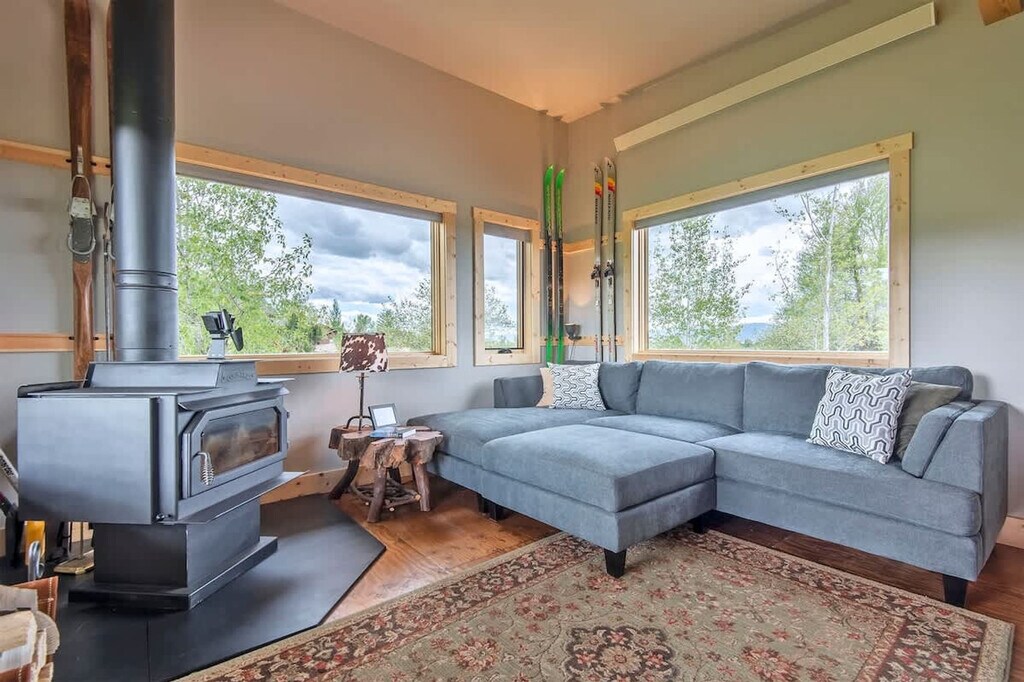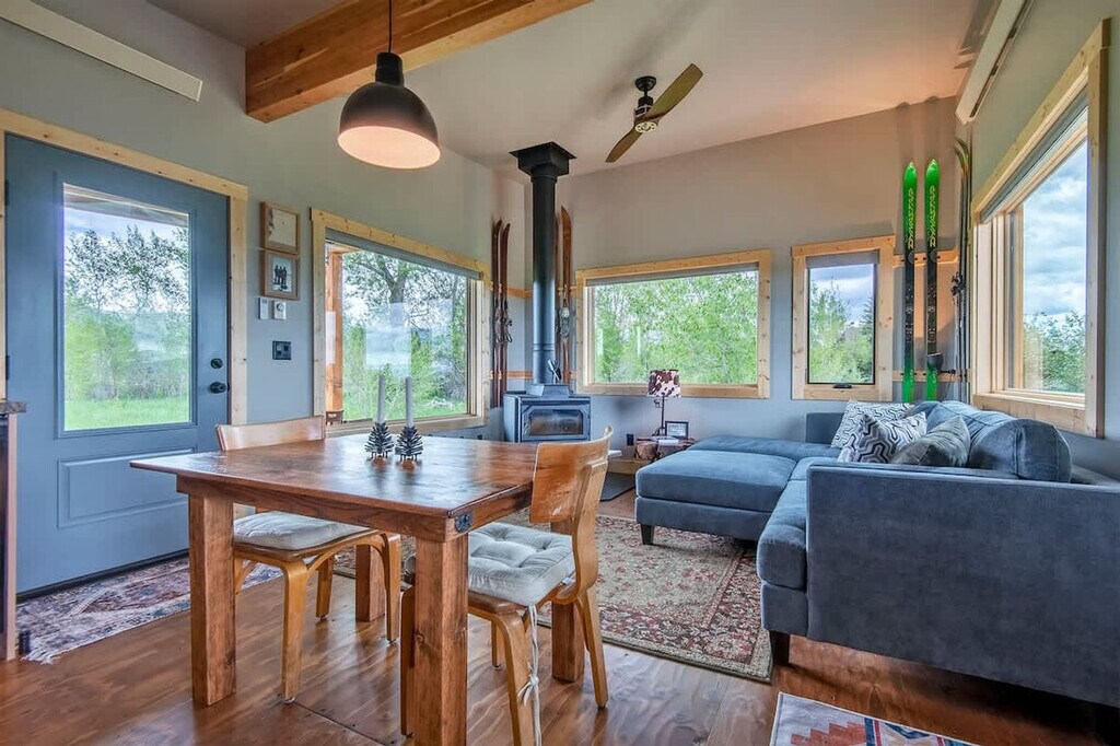 If you're searching for the ultimate retreat to unplug and unwind, this charming 1-bedroom cabin off Ski Hill Road is your ideal getaway in Teton Valley. Escape the distractions of daily life as this cozy cabin offers no TV, allowing you to fully embrace the serene beauty around you. Step into a bright, open living space where windows on all sides frame stunning views of the natural surroundings. The kitchen and living room blend seamlessly, creating a space filled with natural light and offering a calming connection to the outdoors. A sleek, modern bathroom separates the living area from the cozy bedroom. In the living room, you’ll find tasteful mid-century modern accents, while the bedroom is adorned with repurposed 100-year-old cabinets for a touch of rustic charm. The eastern porch offers a unique experience—a vintage Thunder chairlift (#108) sits proudly, providing a perfect spot to take in views of Grand Targhee and the towering Grand Teton in the distance. Crafted with locally sourced Douglas fir wood siding, this cabin beautifully combines rustic character with thoughtful design, creating a warm and inviting atmosphere. Conveniently located, you're never far from world-class outdoor adventure. Grand Targhee Ski and Summer Resort is just 22 minutes away (10.8 miles), where skiing, mountain biking, and hiking await. Jackson Hole Mountain Resort is a scenic 52-minute drive (36.1 miles) to this renowned destination. While you'll enjoy quiet seclusion, you're still close to the natural wonders of the region. Grand Teton National Park is only 58 minutes away (39.8 miles) and Yellowstone National Park's West Entrance is reachable in 1 hour and 46 minutes (95.1 miles). Despite the feeling of complete solitude, you're just minutes from charming local towns like Driggs, ID (5 minutes away, 2.1 miles), Victor, ID (16 minutes away, 10.5 miles), and Jackson, WY (51 minutes away, 34.9 miles). With easy access to Idaho Falls (IDA), Jackson (JAC), and even Bozeman (BZN) airports, getting here is a breeze. The number of people at the property should not exceed the maximum sleeping capacity. Quiet hours are from 9 pm to 8 am, so please be respectful to our neighbors. No events are allowed, including parties, large gatherings, and weddings. No smoking or vaping in the home or on the decks. If any butts are found on the property, an additional charge will be applied. Please turn all exterior lights off at night to preserve the dark skies, which are part of the beauty of our valley. Drive slowly in our neighborhood in respect of children, pets, and wildlife. A maximum of two licensed vehicles is allowed in the driveway and garages. No riding snow machines, dirt bikes, or ATVs in the subdivision or at the rental property. Please do not burn candles or incense in the home when visiting and no fireworks on the premises. Keep all main entry doors locked when not occupied. Fines will apply for violations including but not limited to: leaving garbage in the house or litter on grounds, failure to disclose or clean up after pets, smoking in the house or garage, failure to follow house rules and respect posted signs, failure to follow check-out procedure, mistreatment of hot tub, or violations of local laws. A minimum $500 fine for smoking, vaping, or marijuana in the house, violation of house rules, posted signs, laws, or failure to vacate at check-out time.