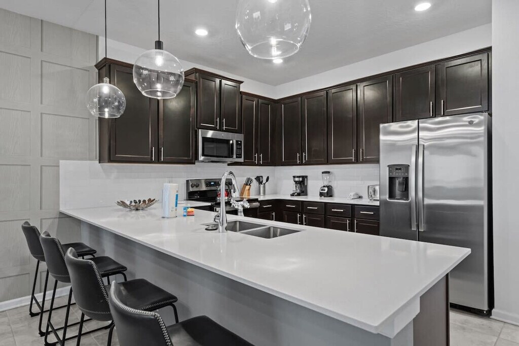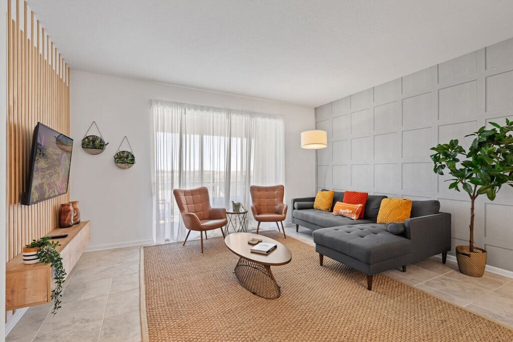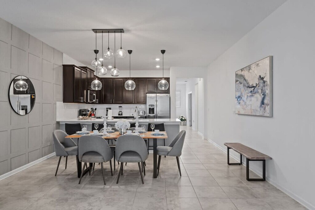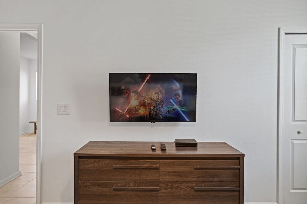 Explore this charming 3-bedroom condo, meticulously crafted for comfort and elegance. Relax in the spacious living room that seamlessly connects to a fully equipped kitchen and dining area. With accommodation for up to 9 guests, enjoy two beautifully decorated bedrooms and a chic king master suite. Step out onto the balcony and take in the breathtaking views. Located in Champions Gate, right beside the incredible club with a water park and mini-golf, offering unparalleled access to resort amenities. Experience the charm of this spacious and sophisticated 3-bedroom, 2-bathroom condo. The generous living room seamlessly integrates with a fully equipped kitchen and dining area, accommodating up to 9 guests. Retreat to the stylish King bedroom suite, or enjoy the Star Wars-themed room with two double beds, sharing a bathroom with the beautifully decorated third bedroom featuring a single and a double bed. Take advantage of scenic views from the balcony. This condo includes a laundry room, complimentary Wi-Fi, covered garage, and a considerate welcome kit with basic amenities for your convenience upon arrival. Guests are responsible for replenishing bathroom and kitchen amenities based on their usage. Champions Gate Resort is a resort-style community that offers every imaginable amenity for a blissful stay. It features an impressive clubhouse with a variety of courts and outdoor activities like tennis, beach volleyball, and a golf course, while its restaurant and fitness center will help you stay refreshed and fit. Its swimming pool complex is perfect for a splashy day, with slides, a lazy river, and a kids splash pool. Plus, the resort is just 20 minutes away from Disney Parks, ensuring plenty of opportunities for fun and adventure. Shopping, dining, and entertainment are also within reach, with stores, restaurants, and supermarkets nearby. It's the perfect place for a family getaway; come and experience all the perks of Champions Gate Resort! Quiet hours are between 22:00 and 8:00. [SI]