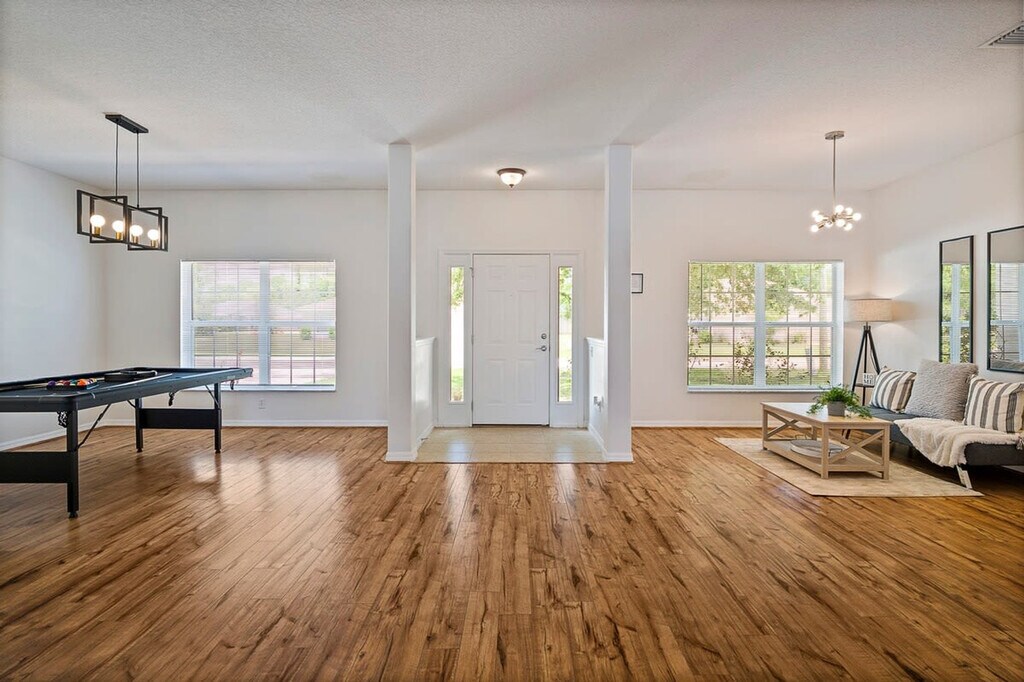 Feel at home in "Whispering Palm", a beautifully renovated 4-bedroom, 2-bath home in Palm Coast that sleeps 8 guests. This inviting home features a spacious living room with a smart TV, a formal dining area, and a fully equipped open kitchen. There is also a game room with a pool table. Enjoy the screened-in pool and a propane grill located outside next to the pool. Pets are welcome with a fee of $100 per pet. The pool can be heated for an additional $50 per day (minimum 3 days), $287 weekly, or $200 per week for multi-week stays. Secure off-site parking for a trailer or RV is available approximately 7-10 miles from the property for $25 per day per unit. Palm Coast is a vibrant, family-friendly community offering easy access to shopping, dining, and miles of scenic walking and biking trails. Located minutes from uncrowded Atlantic beaches and nestled between Saint Augustine and Daytona Beach, this charming city boasts 70 miles of waterways, ideal for fishing, boating, kayaking, and swimming. Quiet hours are between 10:00 PM and 8:00 AM. All pets must be approved and added to your reservation prior to arrival. Pet owners are responsible for cleaning up after their pets at all times. Unapproved pets may result in a fine or cancellation of your stay. Do not set the AC below 75°F. Lower temperatures can cause the system to freeze and stop working. Keep all doors and windows closed when the AC is running to maintain efficiency and avoid system damage. Turn off all lights and electronics when leaving the property. Smoking is not allowed inside or outside the property. A rental agreement must be signed in order to confirm your stay and receive your check-in instructions. Check-in time is 3:00 PM and check-out time is 10:00 AM unless requested and approved. Registration Number: 28--7 [SI]