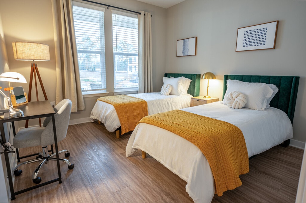 Welcome to this 3-bedroom, 2-bathroom new build retreat with brand new furnishings in the heart of Athens, Georgia. Nestled in a vibrant neighborhood, this home offers a blend of luxurious finishes and Southern charm, ensuring a memorable stay for you and your guests. Located on the 1st floor, it provides easy accessibility. Step into this modern and well-furnished living space, where luxury meets comfort. The apartment features hardwood floors throughout, with each bedroom offering a walk-in closet. The master and secondary bedrooms come with luxurious king-size beds with memory foam mattresses, while an additional bedroom offers two twin-size beds and a workstation. The fully equipped kitchen is a chef's delight with granite countertops and stainless steel appliances, including a dining table with seating for six and four countertop stools. Enjoy the stylish living area with contemporary furnishings and a 55” flat-screen smart TV set up with Netflix and Hulu. Enjoy 3 complimentary parking passes for convenient off-street parking. The community offers a game and pool room, co-working space, private workstations, a fitness center, a yoga room, outdoor grills, and a pool that is open seasonally. Conveniently located, this apartment is just 10 minutes from Downtown Athens, the University of Georgia, and the Georgia Theatre. The Athens Botanical Garden is 15 minutes away, and the Sandy Creek Nature Center is just 10 minutes from your doorstep. A Publix supermarket is within a 3-minute walk, making it easy to stock up on essentials. Your safety matters with a Ring camera located on the exterior part of the apartment. This is a non-smoking residential building and no parties are allowed. Quiet hours begin at 10 pm on weekdays and 11 pm on Friday and Saturday, with no loud music after these hours. Law enforcement will be called if these rules are violated with no exception. Includes a workstation in the additional bedroom, high-speed Wi-Fi, and access to co-working space and private workstations in the community area. [SI]