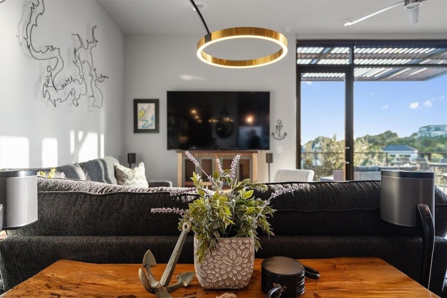 Lake Travis Waterfront Luxury Fully Furnished Modern Condo Experience lakeside living at its finest in this stunning Lake Travis waterfront condo, offered completely furnished right down to the charming lake-inspired decor. Just bring your suitcase and start enjoying the good life. This modern masterpiece features steel beam construction, concrete, stucco, and warm wood accents, blending contemporary design with natural beauty. The open-concept layout showcases floor-to-ceiling windows that frame breathtaking panoramic views of Lake Travis from the living room, dining area, and kitchen. Step out onto your expansive wraparound deck, where you ll find an inviting outdoor living and dining area, complete with a BBQ grill perfect for entertaining or soaking in the views that stretch for miles. Watch the Fourth of July fireworks from Mattress Mack s place across the cove right from your deck. The condo offers two spacious bedrooms, including a primary suite with a private bath, and a guest bedroom with an adjacent hall bath. Every detail has been thoughtfully curated to reflect a relaxed yet refined lakeside lifestyle. The well-maintained modern complex offers resort-style amenities, including: * A negative-edge pool overlooking the lake * An 18-person hot tub * A fully equipped outdoor kitchen and BBQ area * Plentiful lounge seating for sunbathing or socializing * Beautifully landscaped grounds and freshly paved drives * Boat slips available for easy lake access * Whether you re looking for a full-time residence, weekend retreat, or investment property, this Lake Travis gem delivers the ultimate in style, comfort, and convenience. Turnkey waterfront luxury is waiting for you.