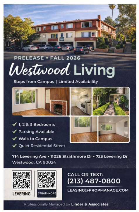 Property Id: 496541 I wanted to personally invite you to visit us at the 2026 UCLA Housing Fair. The event details are outlined below: LINDER AND ASSOCIATES! Date: Wednesday, January 28, 2026 Time: 10:00 AM - 2:00 PM Location: Ackerman Grand Ballroom, UCLA Campus Psst: We have one unit available for immediate move-in. See below! • 11028 ½ Strathmore (2BR, 1B) To avoid unnecessary application fees, please call us at BEFORE submitting your application. ASK FOR ESMERALDA. We can let you know if another application has already been received for the unit you're interested in. This way, you can be sure your application has the best chance of being considered.