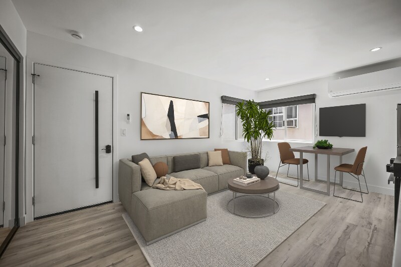 Property Id: 2197223 | EXTERIOR | - Newly Modernized Façade - City Approved & Completed Earthquake Seismic Retrofit - Keyless Electronic Entry | INTERIOR | - Cellular Shade Window Blinds - Spacious Designer Floor Plan - Vinyl Plank Flooring | KITCHEN | - Modern Designer Cabinetry - Quartz Countertops - Stainless-Steel Appliances - Refrigerator - Range w/ Oven - Microwave - Open Kitchen Space Layout | BATH | - Tiled Shower and Bath - Glass Shower Doors - Oversized Vanity Mirror | AMENITIES | - Washer & Dryer room - Assigned Parking - A/C Units