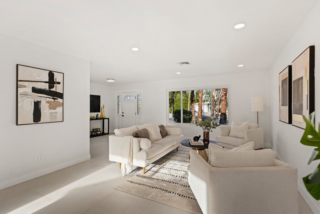 Property Id: 2487163 3 bed, 2 bath single-family home for lease in the desirable Los Compadres neighborhood of South Palm Springs. Set on a spacious corner lot, this updated mid-century modern home offers select San Jacinto Mountain views and a private, easy-living layout. Enjoy a bright open floor plan with large-format tile flooring, recessed lighting, and an updated kitchen with quartz counters, warm cabinetry, and a 6-burner stove. The backyard features a swimming pool, sun-filled patios, and a seamless indoor-outdoor living. An extra gated side yard with a mature lemon tree offers additional private outdoor space. Additional features include a 2-car garage and no above ground power lines. Offered unfurnished, with the option to be furnished if desired.