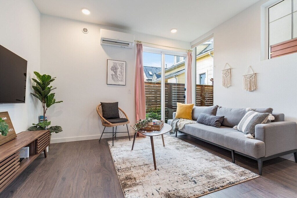 Feel at home in this modern townhome on a quiet street, located next to Seattle University. This 1073 sqft home has 2-bedrooms and 2-bathrooms and is a 4-story townhome (including the rooftop) with a staircase walkway to the entrance. This home features a great floor plan with a bed and bath on different levels, perfect for group travel. Mini-split air conditioning keeps the home cool in the summer heat. The kitchen is stocked with high-end kitchen appliances, cookware, silverware, servingware, spices, Keurig coffee and tea. High-quality beds, mattresses, pillows and linens ensure comfortable sleeping. A smart TV and high-speed internet are available for streaming or remote work needs. An on-site washer and dryer are available for your laundry needs. Enjoy the rooftop patio with comfortable outdoor furniture for an al fresco experience. Parking is available for two cars: dedicated parking and one extra parking permit for free street parking. Well-trained pets are welcome at $50 per pet per night. With a walk score of 96, this city center townhome is within walking distance of tons of restaurants, coffee shops, a city park, and a bus stop (line2,12). Amazon, UW, Seattle Japanese Garden, Pike Place Market, Swedish Hospital, Harborview Medical Center, and Virginia Mason Medical Center are all within a 10-minute drive. As one of Seattle’s oldest and most densely populated neighborhoods, First Hill/Cherry Hill provides a unique experience from block to block, with lush tree-lined lanes north of Madison Street, the twin spires of St. James Cathedral, and plenty of quirky local finds in between. The district’s location, nestled between downtown and the colorful Capitol Hill neighborhood, means that calling First Hill home also conveniently positions you to make the most of the entire city. Many dining, shopping, and entertainment options are within walking distance, and many bus stops are less than a 5-minute walk away. Ride-share services are highly recommended. This townhome is not handicap friendly, and guests must be comfortable with stairs as there are multiple stories. Quiet hours are between 10 pm and 8 am, and there is a $500 fine per violation for parties and events, smoking or vaping of any kind anywhere on the property including outdoor areas, digital piracy, and wearing shoes in the home. Please refrain from allowing pets on furniture and linens, including couches, throws, beds, pillows, and towels. Please do not leave pets unattended and bring poop bags to pick up after your pets. Registration Number: STR-OPLI-22-001966 [SI]