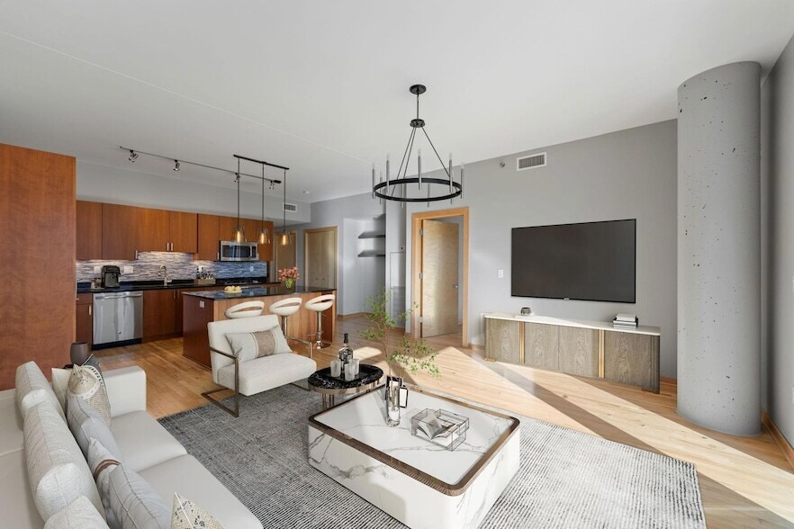 Gorgeous 2BR with 2 Pkg stalls and most utilities included with rent available in the heart of the Mill District! You ll love the hardwood flooring throughout, custom closet organizers, full-size washer and dryer, and large balcony with gas grill hookup. Gourmet kitchen features gas oven, granite countertops, tons of cabinetry, stainless steel appliances, under-cabinet lighting, island, and tiled backsplash. Stonebridge Lofts puts you steps from Gold Medal Park and provides fitness center, community deck with pool and jacuzzi, community room, community lounge, indoor/heated guest parking, playground, and seasonal art displays from local artists. Included with rent: 2 indoor heated parking stalls, 1 storage unit, basic cable & internet, gas, and water/sewer/trash. Tenant responsible for electricity. App Fee: $78 per adult; Admin Fee: #150; Move-in Fee: $500; Security Deposit is One Month s Rent.