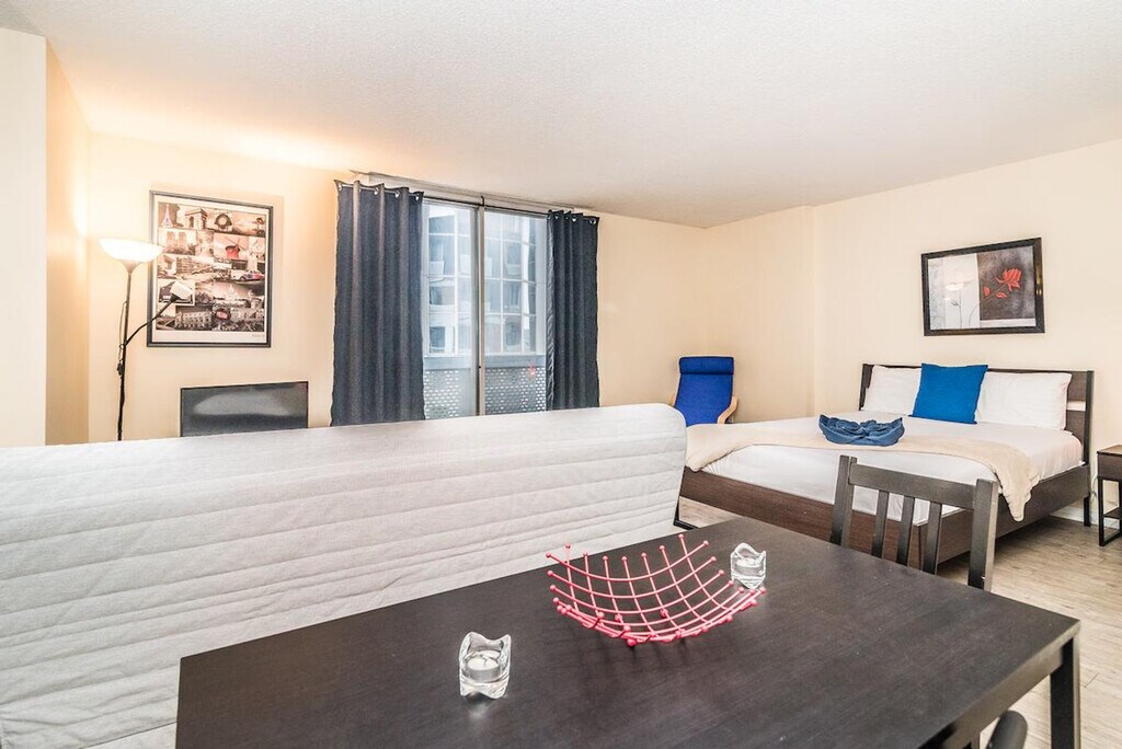 In the heart of Montreal's vibrant streets, this apartment stands as a sanctuary, a haven veiled from the city's frenetic pace. Behind the elegant facade of the hotel that shares its name, lies a community that thrives on exclusivity and luxury. Residents enjoy a lifestyle where tranquility intertwines seamlessly with urban convenience and desire is within reach, just a stone's throw away from the serene enclave they call home. This studio apartment welcomes you with a queen bed and a full bathroom, offering a cozy retreat for two guests. After visiting some exceptional apartments ourselves, we've strived to make this apartment as welcoming and cozy as possible for our guests. Enjoy a Smart TV for your viewing pleasure and stay seamlessly connected with high-speed Wi-Fi throughout your stay. Indoor parking with in/out privileges is available for an additional fee, depending on your length of stay. We also offer a variety of cleaning services, including bi-weekly or monthly options, for an extra charge. Located in the heart of Montreal, this apartment offers urban convenience with tranquility. The vibrant streets provide easy access to the city's attractions, dining, and entertainment, all within a short distance from your serene enclave. No parties of any kind or loud noises that can alter the harmony of residents are allowed. Smoking of any kind, including cannabis and cigarettes, is prohibited inside the apartment, balcony, or the building. Please care about your home away from home. Includes high-speed Wi-Fi for seamless connectivity.